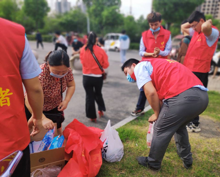 在临泉一中校门口,十一公司临泉金科城项目部8名管理人员同样组成了志愿服务队,为高考学子发放矿泉水等物品。
