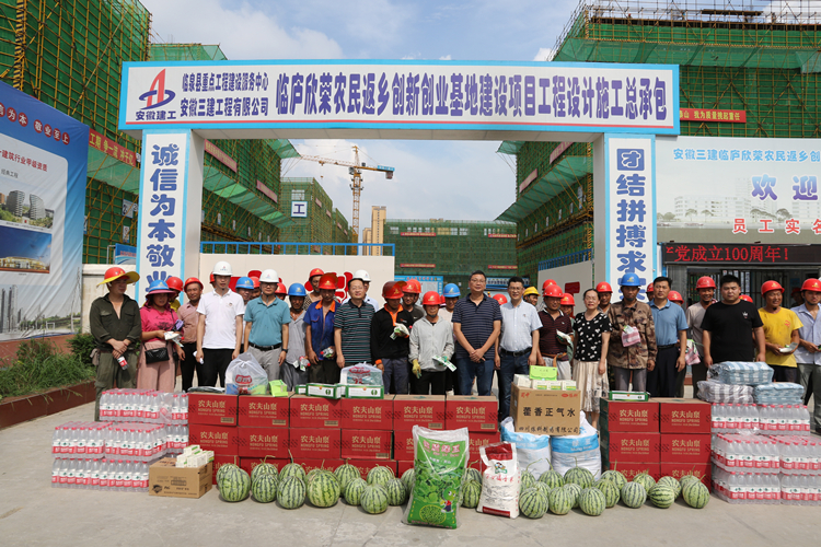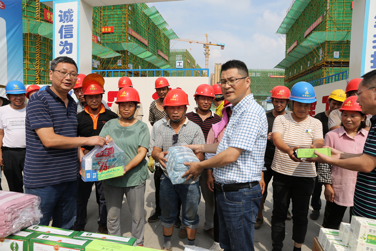 连日来,临泉县持续高温,为深入开展“我为群众办实事”实践教育活动,7月21日,临庐产业园管委会与公司工会共同深入项目施工现场开展“送清凉,送健康,送关爱”活动,为项目一线员工送去了夏日关怀,同时叮嘱项目管理人员严格做好夏季施工作业的各项防护工作,确保高温天气施工安全。临庐产业园管委会副主任曹曙光、规划建设局局长臧应,公司副总经理张为政等参加慰问。