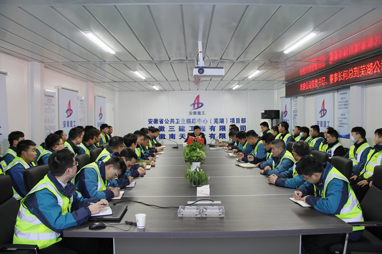 调研中,项目投资方芜湖宜居投资(集团)公司董事长沈世跃向调研组一行介绍了该项目的基本概况及目前施工情况,安徽三建公司党委书记、董事长何洪春就节后复工具体工作安排及施工进度作简要汇报。调研组对两单位的有关工作安排以及安徽三建施工管理水平给予了充分肯定,并要求安徽三建一定要打造精品工程,又快又好推进项目施工进度。