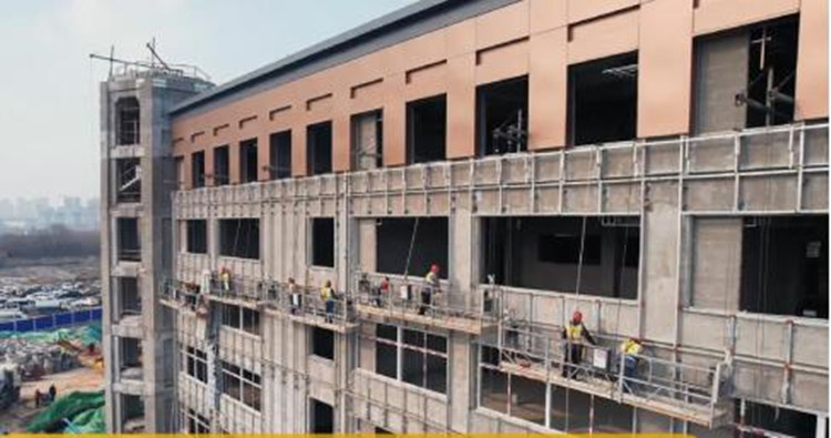 幕墙安装——是该项目的又一大难题,而解决它的前置条件就是吊篮的架设!经测算,该工程的吊篮使用量不低于500台。为此,项目部提前组织观摩多个吊篮公司,制定方案。吊篮安装时正值室外开挖埋管时期,项目部夜间加班,通过先组装后吊装的方式,有效地解决了工作面交叉作业的问题。从2022年1月6日12#、14#宿舍楼的第一批吊篮安装开始,500多台吊篮从告知到验收再到使用登记,项目部加班加点仅用20天就完成了工作,使吊篮的整体使用时间比预期缩短了15天。科创中心楼位于项目西南角、南大门西侧,正处于形象展示样板区域,春节前必须安装到位。当时已近年关,大量的劳务人员已踏上返乡的路程。为了不影响项目进度,项目部与吊篮租赁公司多次沟通协调,动之以情,晓之以理,最终在年前把第一批吊篮架设成功,并顺利通过验收,为节点性样板间的按期完工奠定了基础。把一切能提前、能加班完成的工作提前完成、加班完成——这是项目所有人的统一思想。