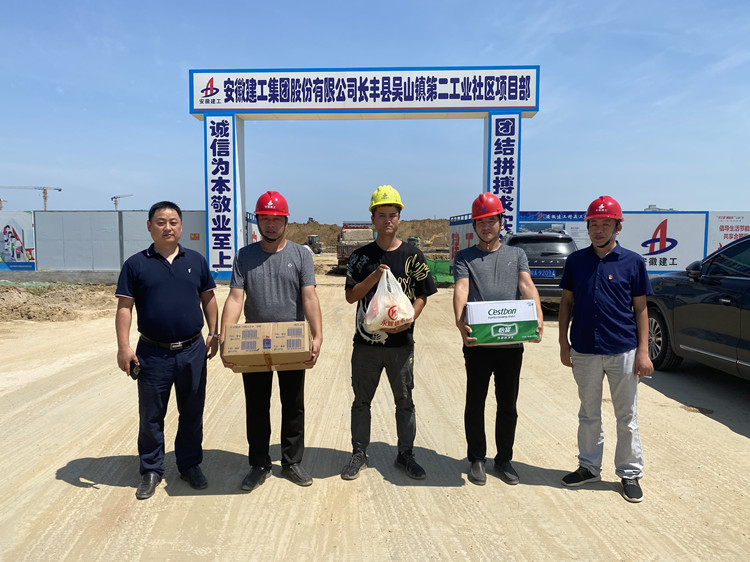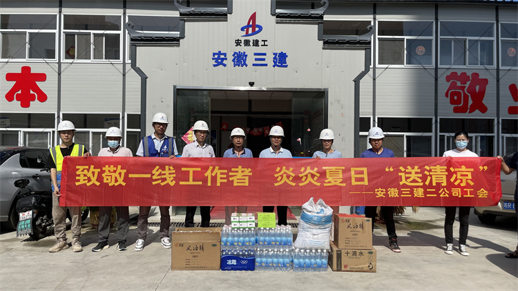 7月12日和7月13日上午,二公司副经理侯强、李国先后赴合肥市第一中学校园品质提升工程、新建艺术礼堂项目施工总承包工程(含安装公司、装饰公司职工)、合巢产业新城郭塘新村、映湖公租房项目施工二标段开展夏日“送清凉”活动,为70多名管理人员、400多名一线工人发放防暑降温物品。