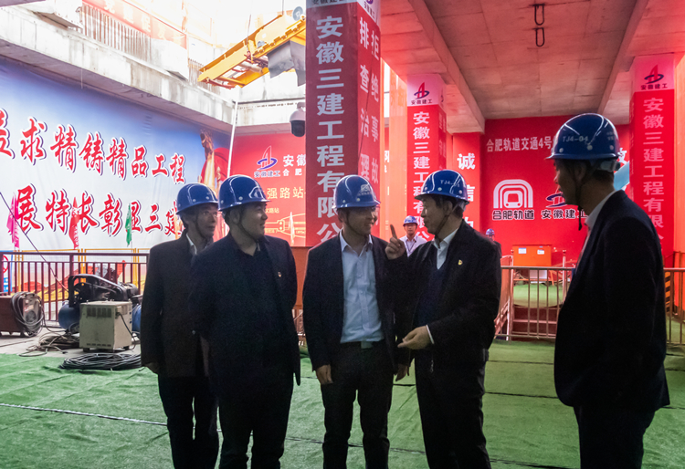 吴越一行首先来到安徽三建合肥地铁4号线4标段项目部,参观了项目部党员活动室,了解了项目部党建活动开展情况。随后,吴越一行深入三建施工的大强路和中铁七局武汉公司施工的花山路站施工现场。在大强路站,吴越具体了解了大强路站施工建设情况,详细询问了盾构施工情况和现场三建“党员监督岗”活动的开展情况,他说,安徽三建项目党建紧密结合工程建设,支部进项目、下工地、真正落了地。