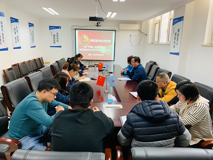 为深入学习贯彻习近平总书记关于力戒形式主义、官僚主义的重要论述和指示批示,坚持“三严三实”,大连公司党支部3月19日下午3:30在会议室召开专题学习会议,传达学习集团公司党委、安徽三建公司党委有关开展“严规矩、强监督、转作风”集中整治形式主义官僚主义专项行动的文件精神。支部党员和入党积极分子共15人参加了专题学习会议。
