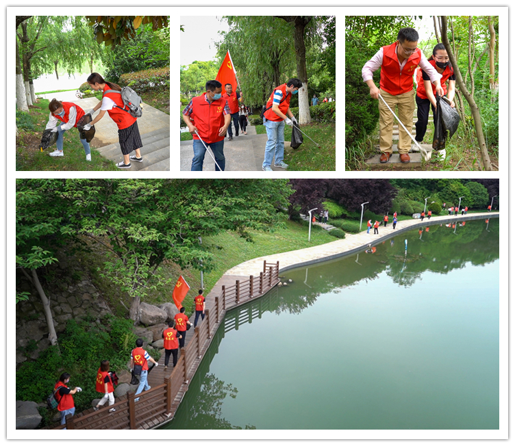 当天下午党员志愿者从合肥市中心图书馆项目出发,在飘扬的党旗引导下,沿着风景宜人的天鹅湖公园人行步道,捡拾散落在公园各处的塑料瓶、果皮、纸屑、烟头等垃圾,让天鹅湖更干净美丽。身着鲜红马甲党员志愿者的身影在绿荫掩映下分外醒目,他们的行为得到了游人的称赞。