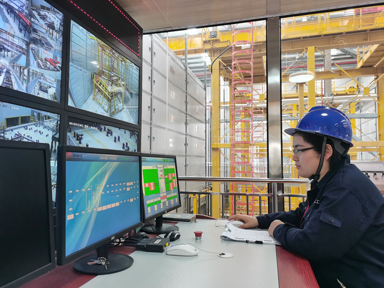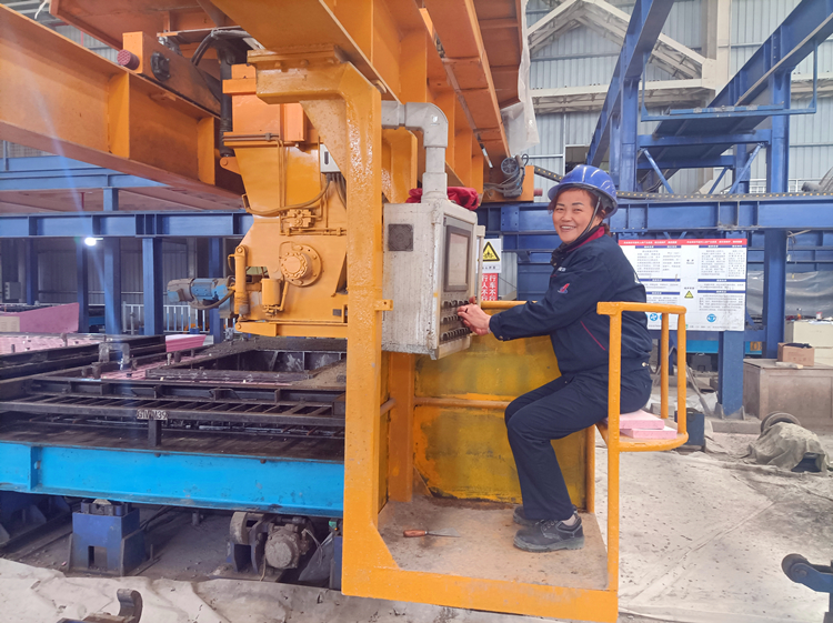 北城工业公司养护窑中央控制室操作员黄霜正在使用码垛车进行构件存取操作