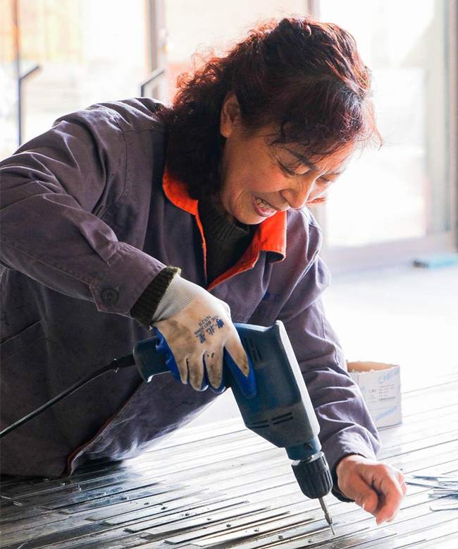 门窗公司女工王来菊在车间工作区域进行材料加工工作,抢门窗生产进度