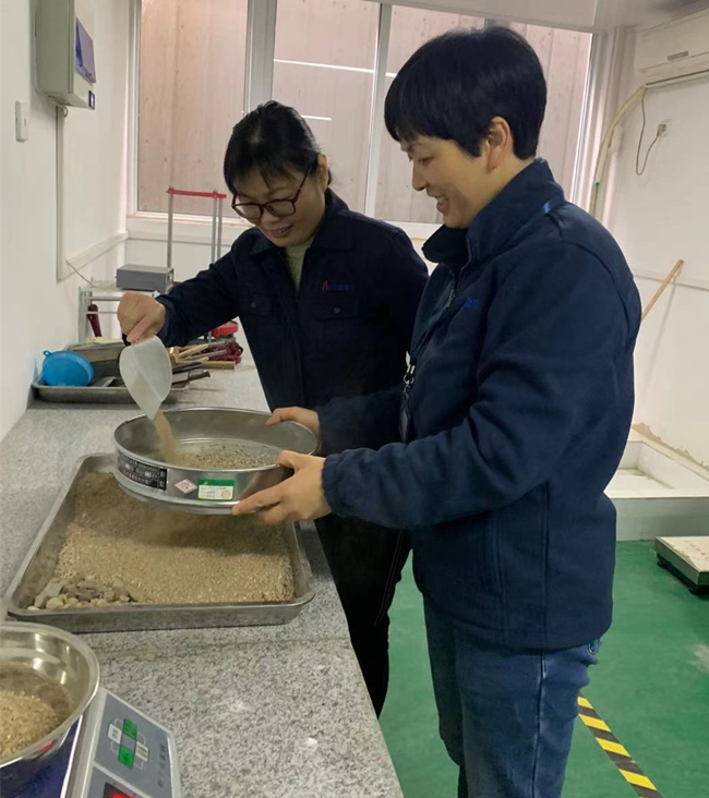 工程研究院实验室职工袁家敏与杨珣正在集料室做砂子筛分析试验