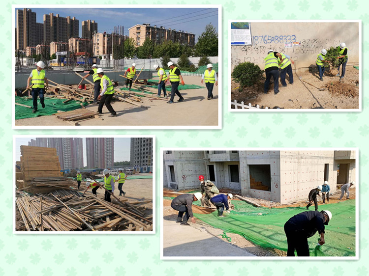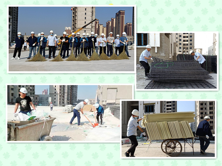5月1日是赞美劳动者的日子,大连公司各项目组织义务劳动活动致敬最美劳动者。各区域项目职工主动的开展清扫现场、规程材料的义务劳动活动,用他们的实际行动充分展现着“我劳动,我快乐”的精神。其中,烟台项目部30余名管理人员共清理现场建筑垃圾30余车,搬运保温材料20立方,搬放钢丝网片5立方;济南澜湖郡幼儿园小学项目,10余名管理人员共规整钢管、木方等现场材料10立方,为项目现场栽种绿植共10平米;大连金连领地项目部共15名管理人员集中清扫施工现场600平,绿网铺盖露土共1000平米。辛苦劳动后,项目现场恢复整洁,职工们边擦汗水边喊着“劳动最光荣!”。