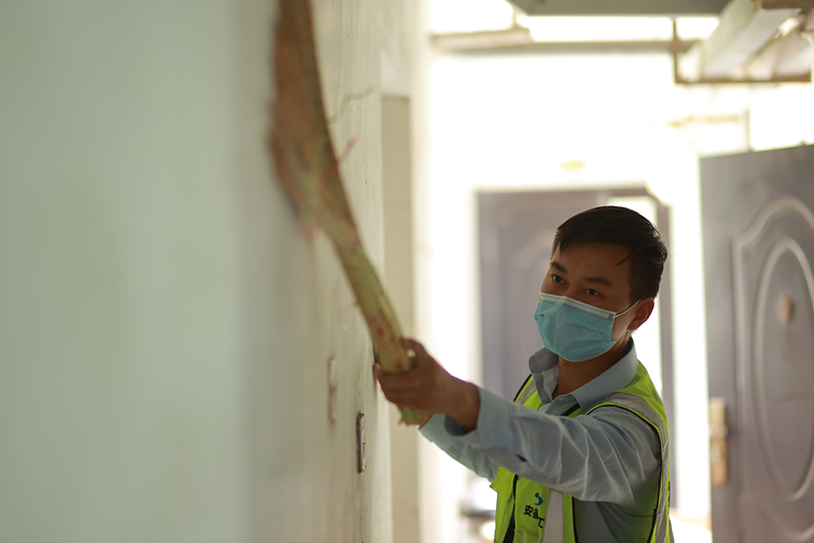 21日下午6点,项目建设全面铺开,同步推进,十几个专业、220多名建设者,4辆大型运输货车通宵鏖战,面对超大面积、超短时间的建设任务,安徽三建倒排工期,采取“分区作战,分时推进”模式,模块化运作,提升管理精度,共计完成施工面打磨约850平米,墙面天棚铲除、批腻子440平米,裂缝处理280米,水电维修2000余处,对约14万平米的528套隔离房进行了7遍卫生清洁,整个健康驿站以小时为单位快速成型。23日下午6点,528套隔离间全部改造完成。