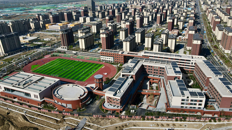 落成投用的新教学楼整体呈“U”字形,宛如一条卧龙,红白相间的墙面与蓝天白云相映生辉。教学楼旁,学校的“新客人们”在新建起的运动场上举办升旗仪式,同学们脚下所踩的每一寸土地,目光所及的每一处建筑,都是由一群日夜奋战的城市建设者的心血浇灌而成。