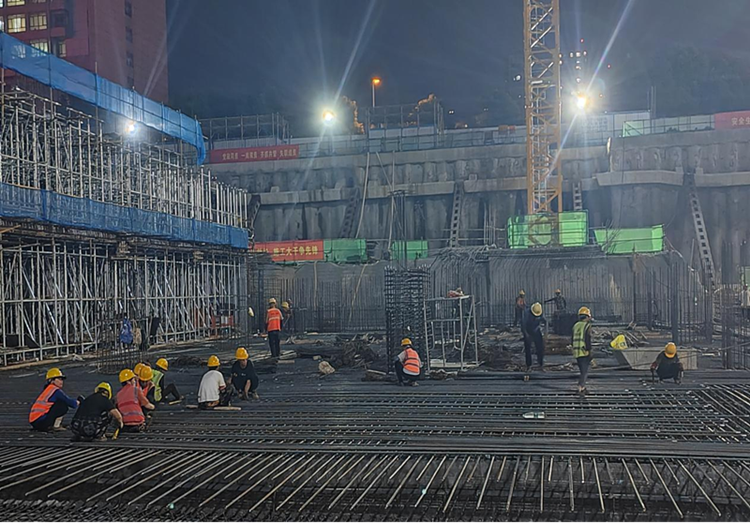 项目地理位置特殊,施工场地狭小,加之前期受土方外运及中高考影响,为项目施工造成诸多困难。为确保施工进度,项目部增加了资源投入,全员采取“5+2、白+黑,阴雨天不停歇”的科学高效轮转的工作方式,凝心聚力,克服困难,全身心投入到施工现场,确保现场各施工节点可控。同时针对项目三层地下室及型钢混凝土结构施工难度大、构造复杂的特点,项目部制定赶工措施,合理安排工序,并做好材料的供应保障,塔吊24小时连续作业,科学利用有限时间,坚决打好基础建设攻坚战。