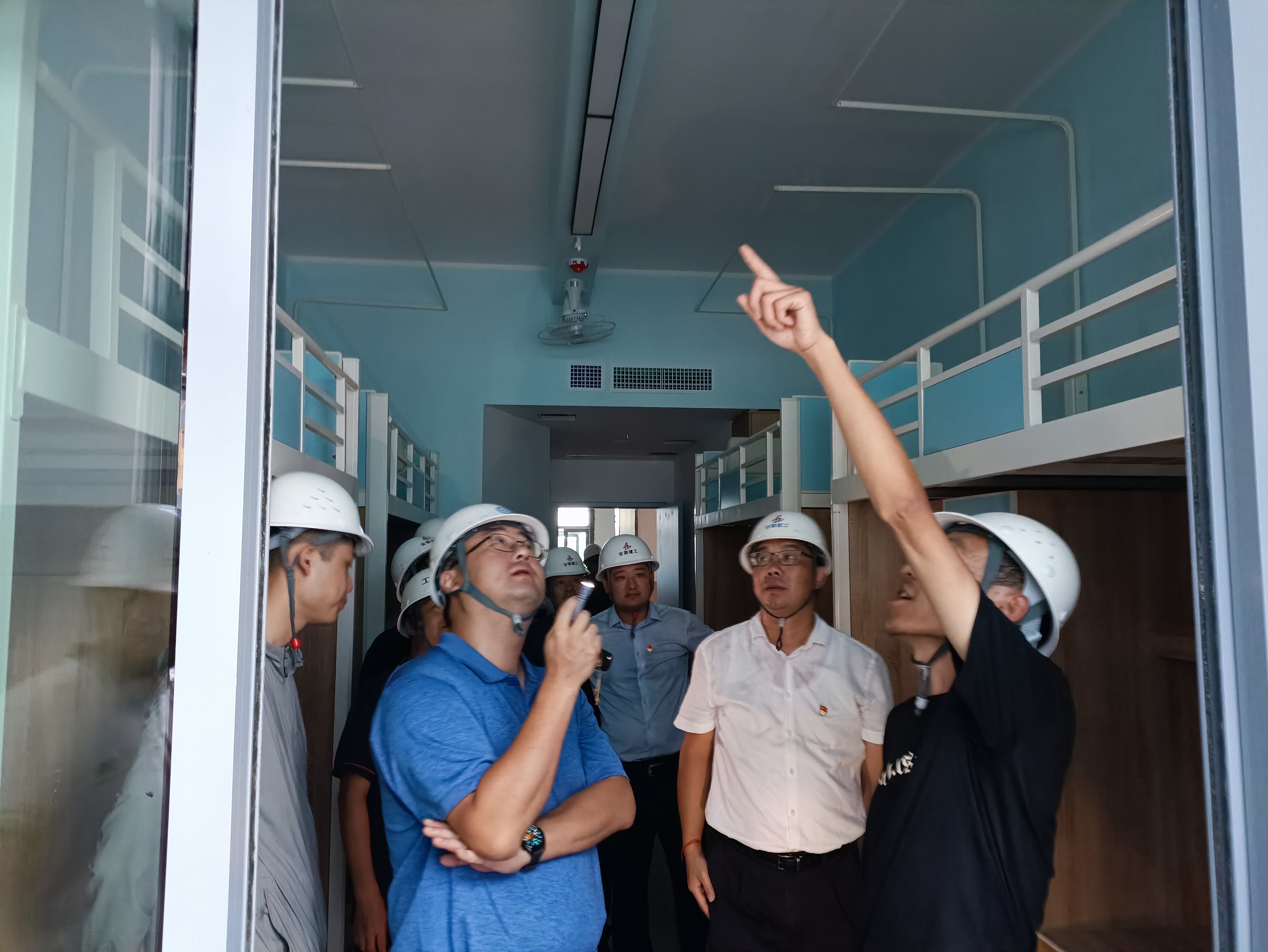 胡晨一行参观了宿舍区装饰样板区,听取了装饰公司项目负责人对宿舍样板区的详细介绍,了解了项目施工进度、安全文明以及施工质量等情况,对项目建设现阶段工作取得的成果给予肯定。胡晨一行还对学生宿舍、教师宿舍、宿舍过道等装饰效果进行了定样。
