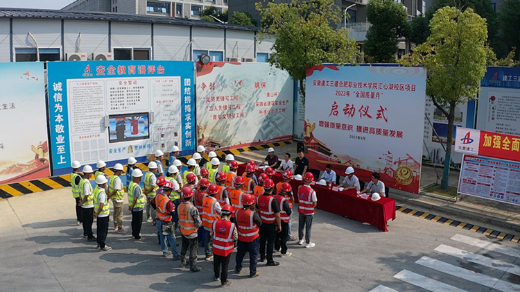 9月11日上午,八分公司合肥职业技术学院汇心湖校区项目召开2023年“质量月”活动启动仪式,新站区建筑质量安全监管中心副主任袁大为、八分公司副经理李江顺等人参加活动。