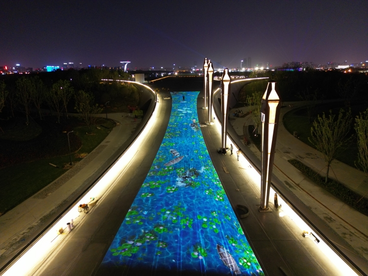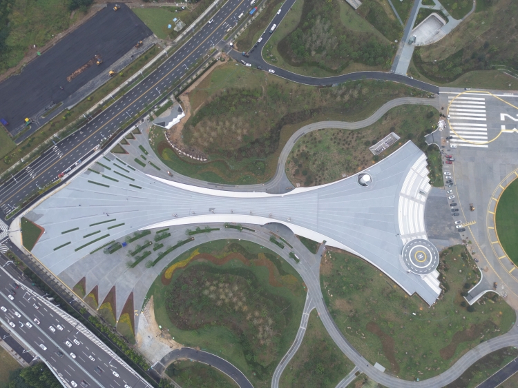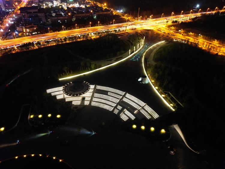 如今,站在合肥园博园南入口宽阔的广场上,可以看到数根细长的线条从脚下一直向坡道尽头延伸,象征着飞机爬升过程中的气流形态。沿着150米长的缓坡道步行而上,可见右侧耸立着七根高度为11.5米的有着“七星揽月”美誉的景观灯,夜间不仅能为游客带来暖色的柔和灯光,最顶端硕大的全色激光投影仪还能在坡道面上投下美轮美奂的动态画面,将入口装点得更加梦幻。登顶8米高的观景平台,右侧是圆形的直升机停机坪,向远方眺望,3公里长的机场大草坪和整个园博园的景色尽收眼底,引人不由驻足观赏。
