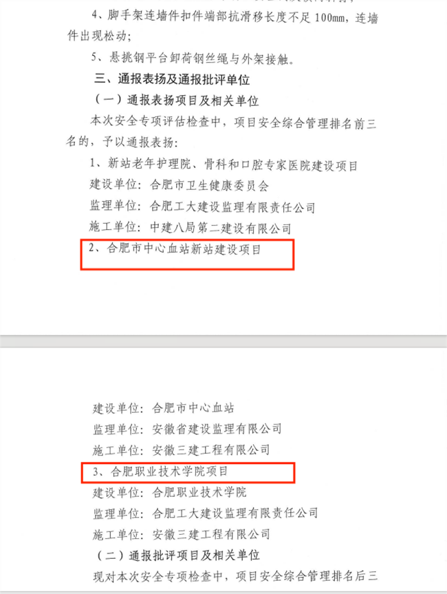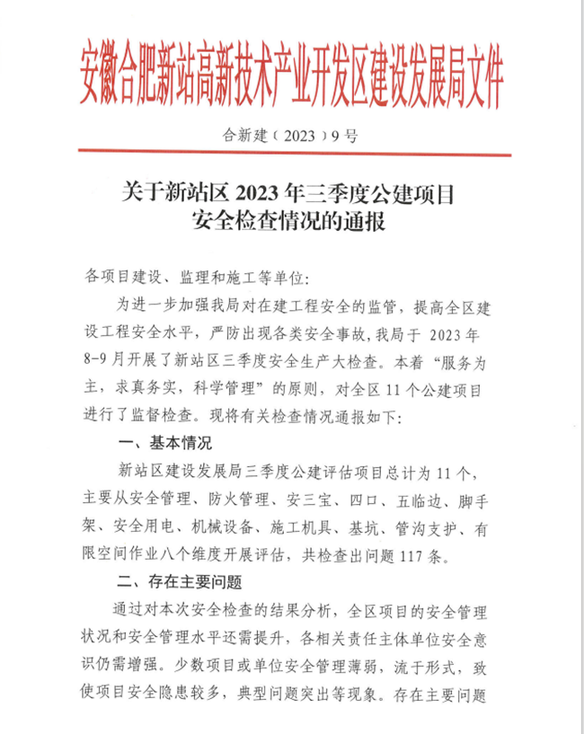 近日,公司承建的合肥市中心血站新站建设项目、合肥职业技术学院项目获得合肥新站高新技术产业开发区建设发展局2023年第三季度公建项目安全检查情况的通报表扬。