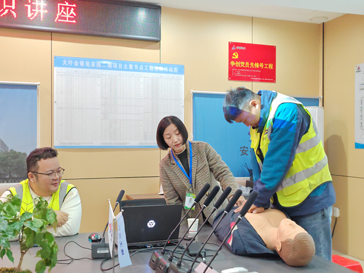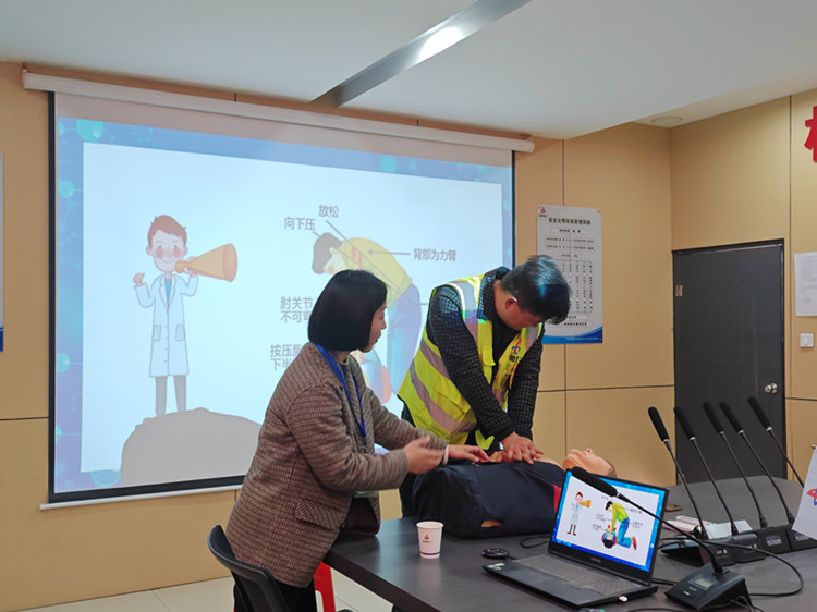 培训内容主要包括常规急救技能(心肺复苏术)和常见疾病的预防及改善。课堂上,老师为大家科普了需要进行心肺复苏的情形、心肺复苏具体操作步骤及心肺复苏的有效判断标准,并现场邀请项目管理人员进行了实操演练。