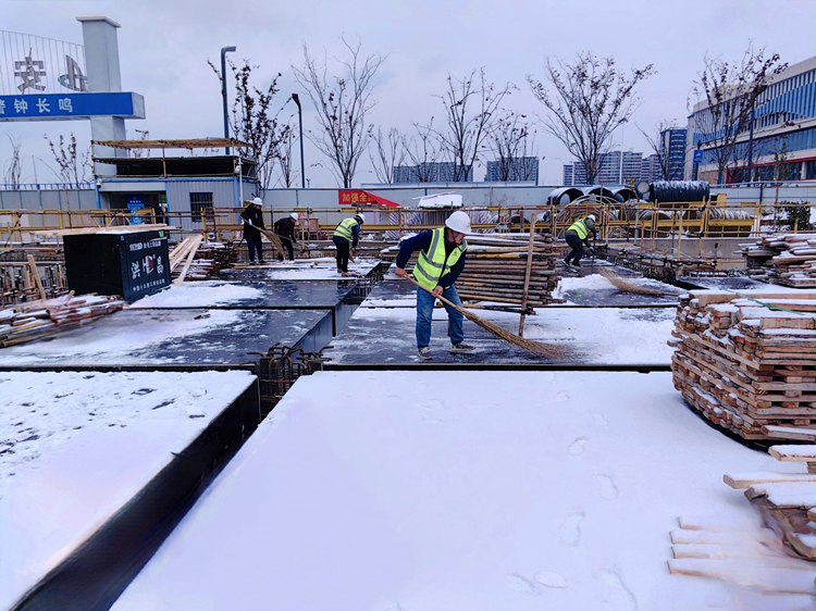 又看!在蜀山经济产业园安装项目施工现场,虽然寒风凛冽、漫天飞雪,但项目依然保持火热的建设状态。为保障项目施工进度和现场施工安全,全体管理人员都参与到清扫施工板面的积雪当中。他们坚守岗位、默默奉献,全力确保各项工程节点的顺利完成。目前,蜀山经济产业园安装项目地下室负二层已全面完工,一、二号楼负一层和三号楼一层预埋也已经全部结束。