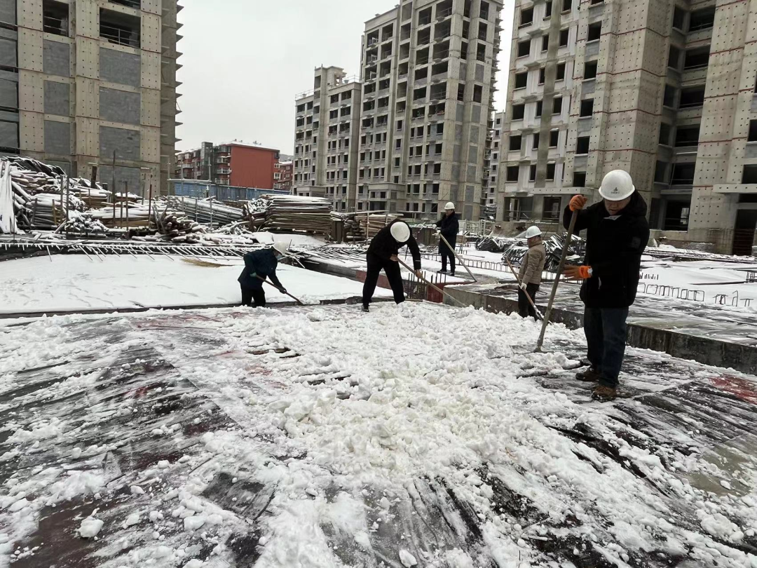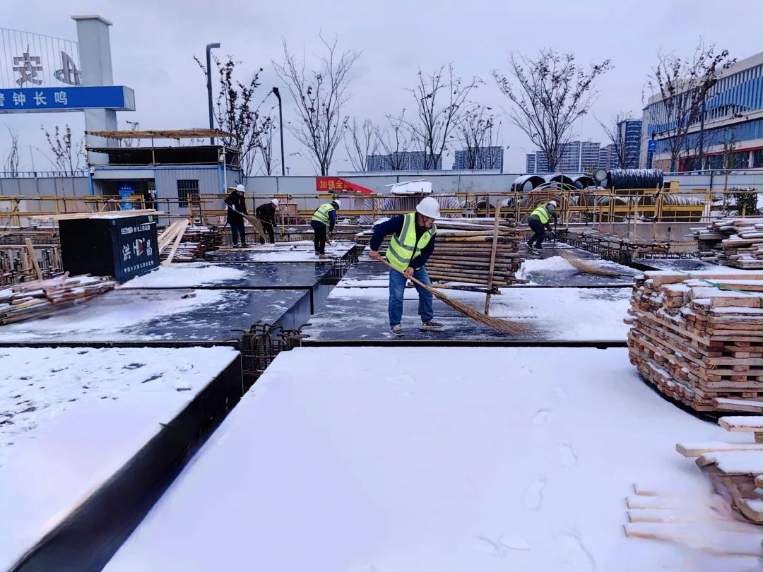 蜀山经济产业园建设项目现场,为保障项目的施工进度和现场的施工安全,全体管理人员都参与到清扫施工板面积雪的活动中。