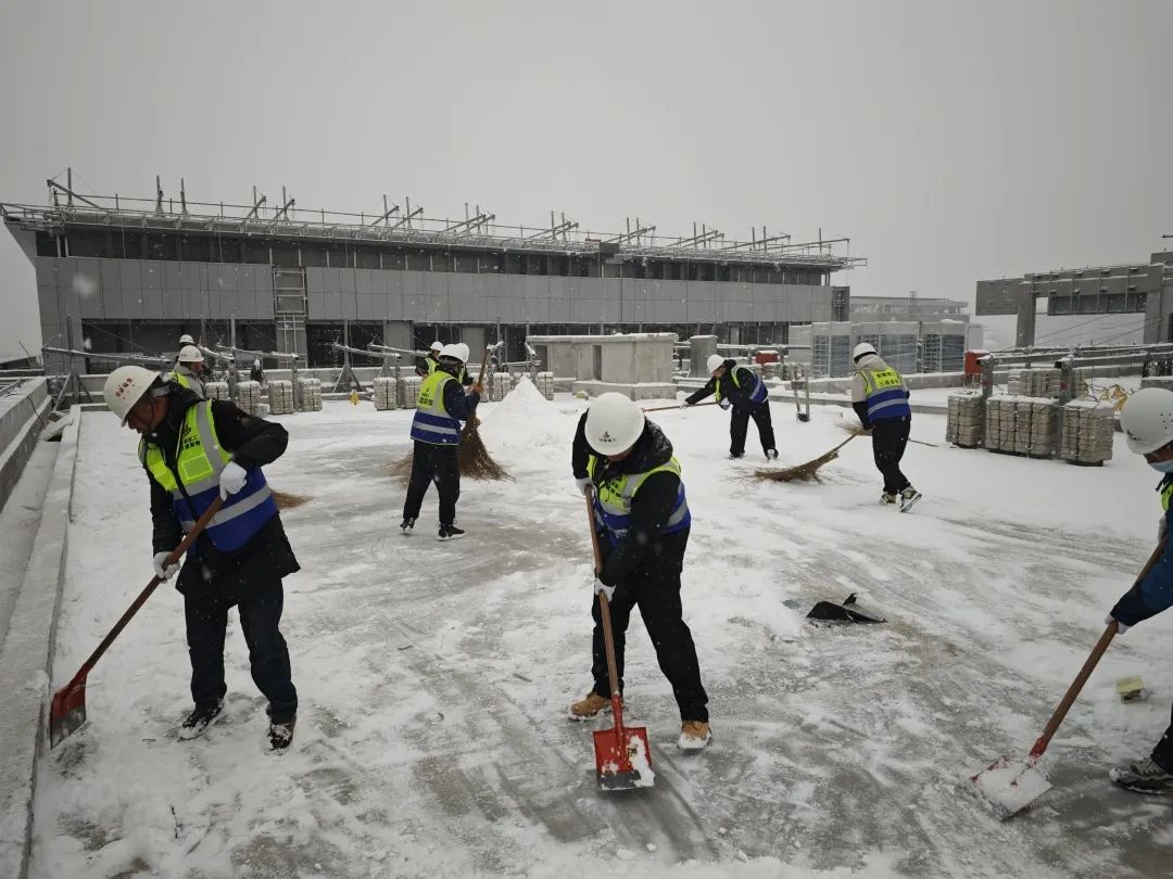 中科院临床研究医院项目施工现场被积雪覆盖,为确保项目生产正常进行,及时消除安全隐患,项目职工自发行动,拿起扫把、铁锹清扫积雪。