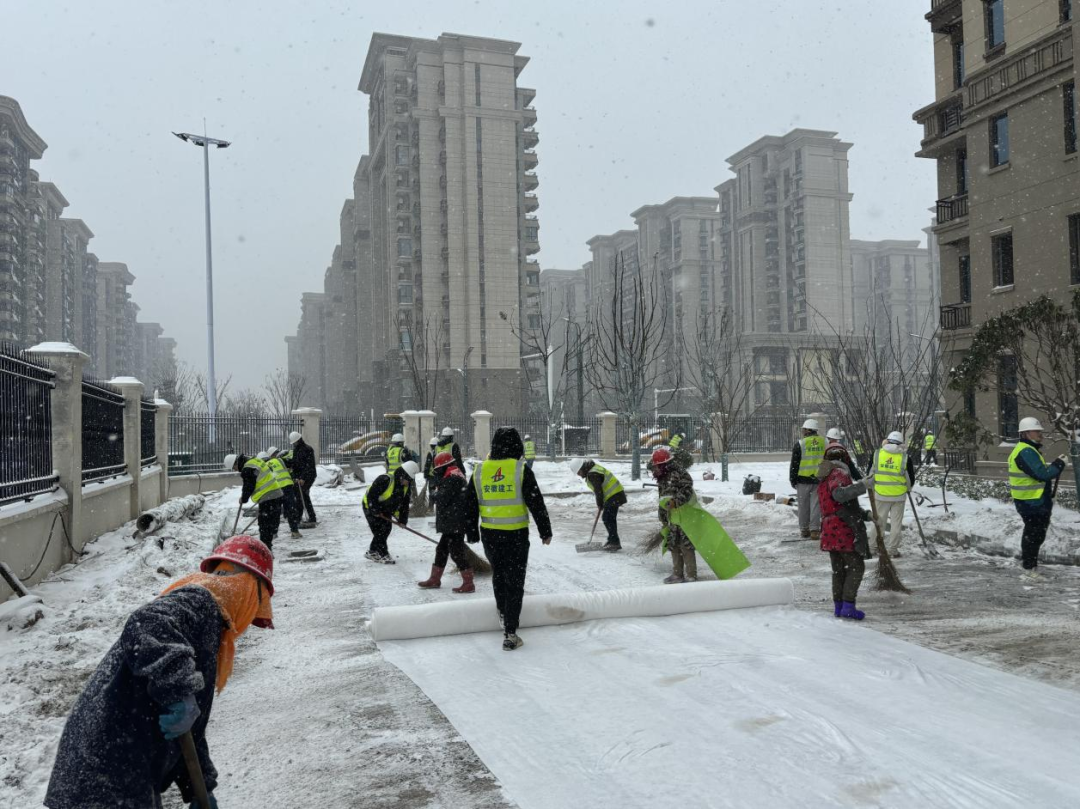 济南君悦府项目组织全体管理人员共20人对办公区、施工现场主要道路、车库顶板等进行除雪,并在雨雪到来之前提前采用密布网对即将浇筑的工作面进行全面覆盖。全体管理人员团结一致、热情高涨,保证了项目安全生产的持续进行。