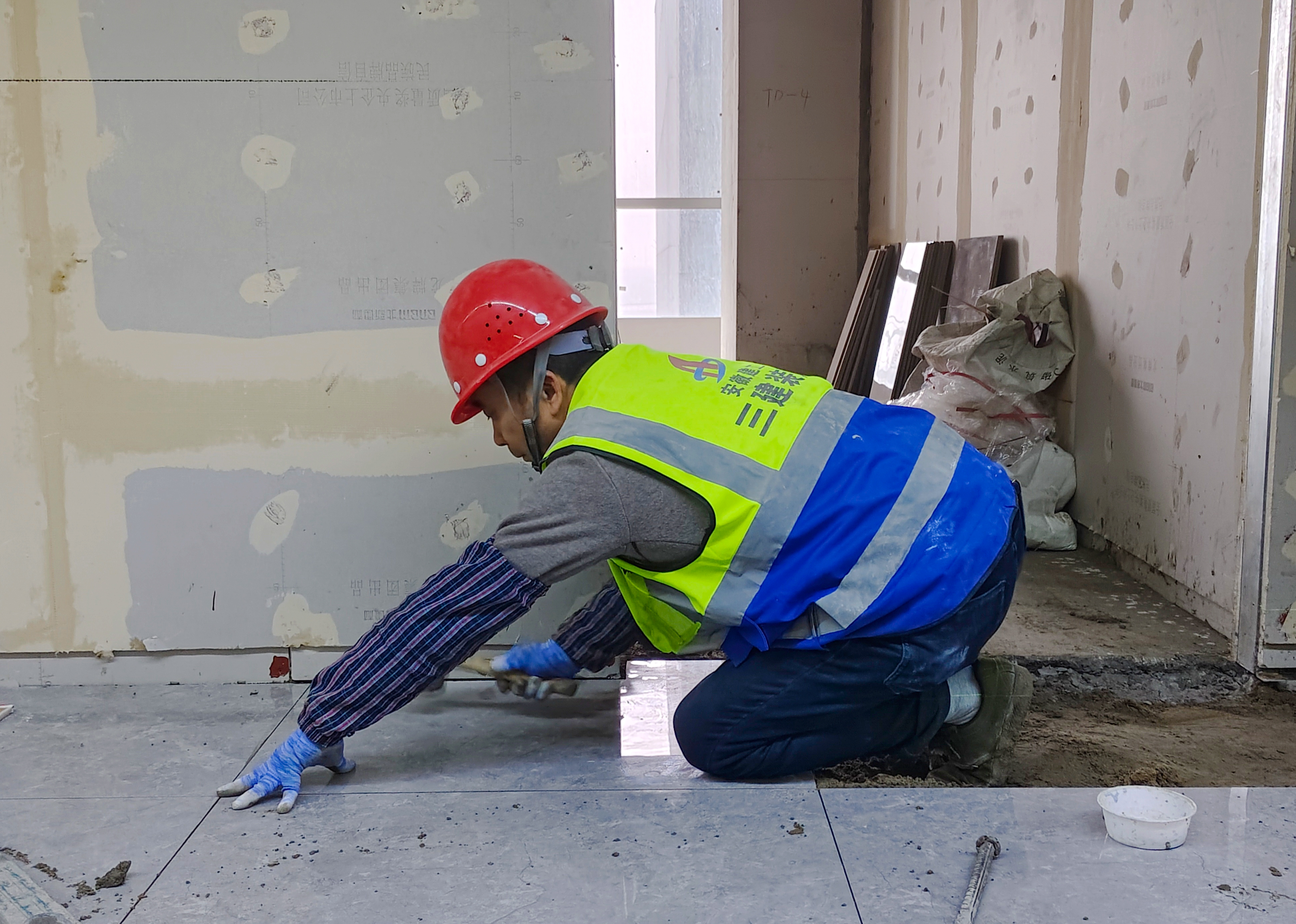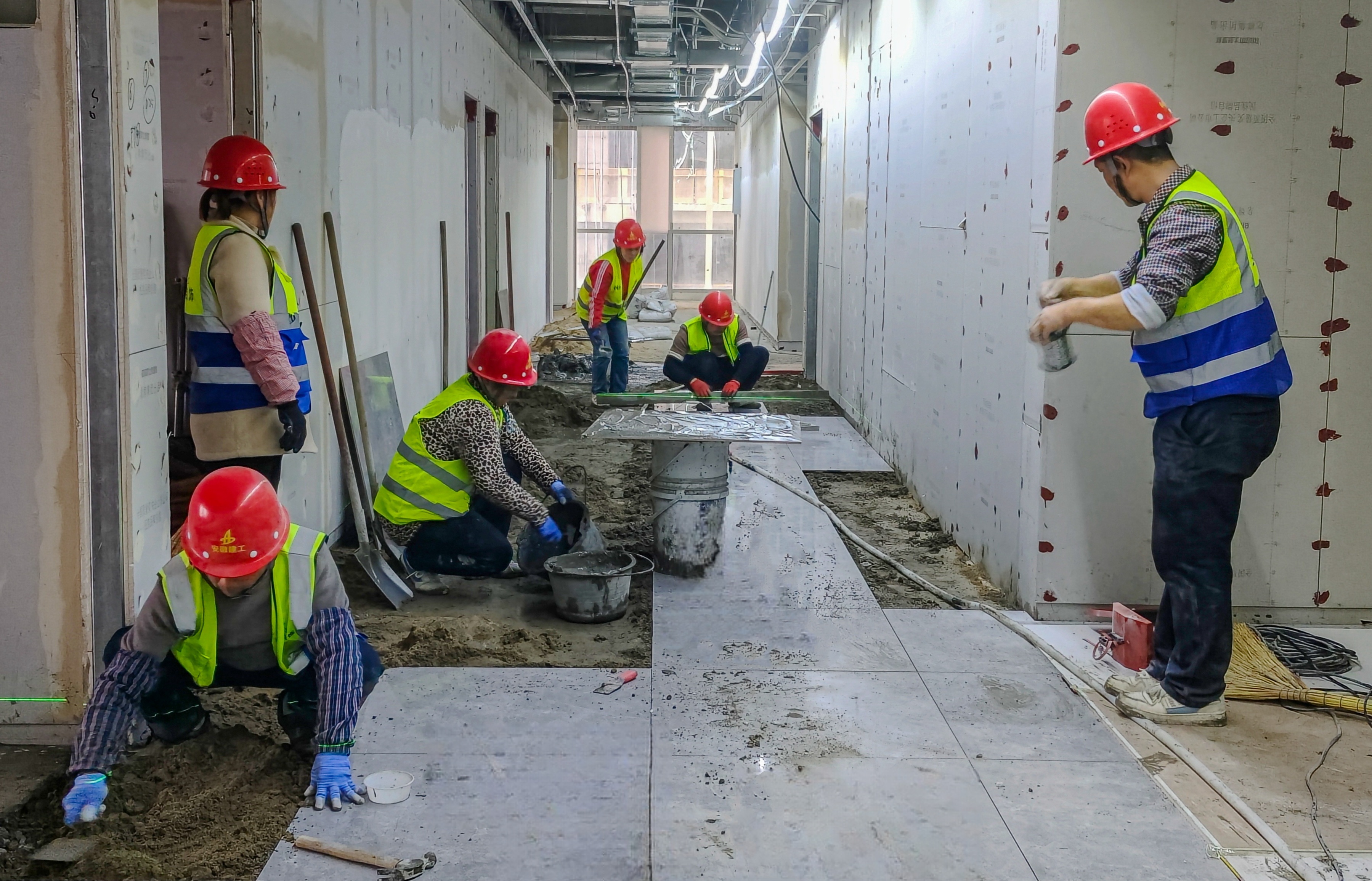 ②1-3层新建隔墙已完成,卫生间防水施工完成70%,安装预埋完成95%,装饰基层已完成70%,4层及以上地坪浇筑完成97%,4层以上轻质隔墙完成95%,大宗基层材料倒运上楼完成95%,地砖铺贴完成45%,墙面一遍腻子批刮完成90%,顶面丝杆打眼布设完成40%。