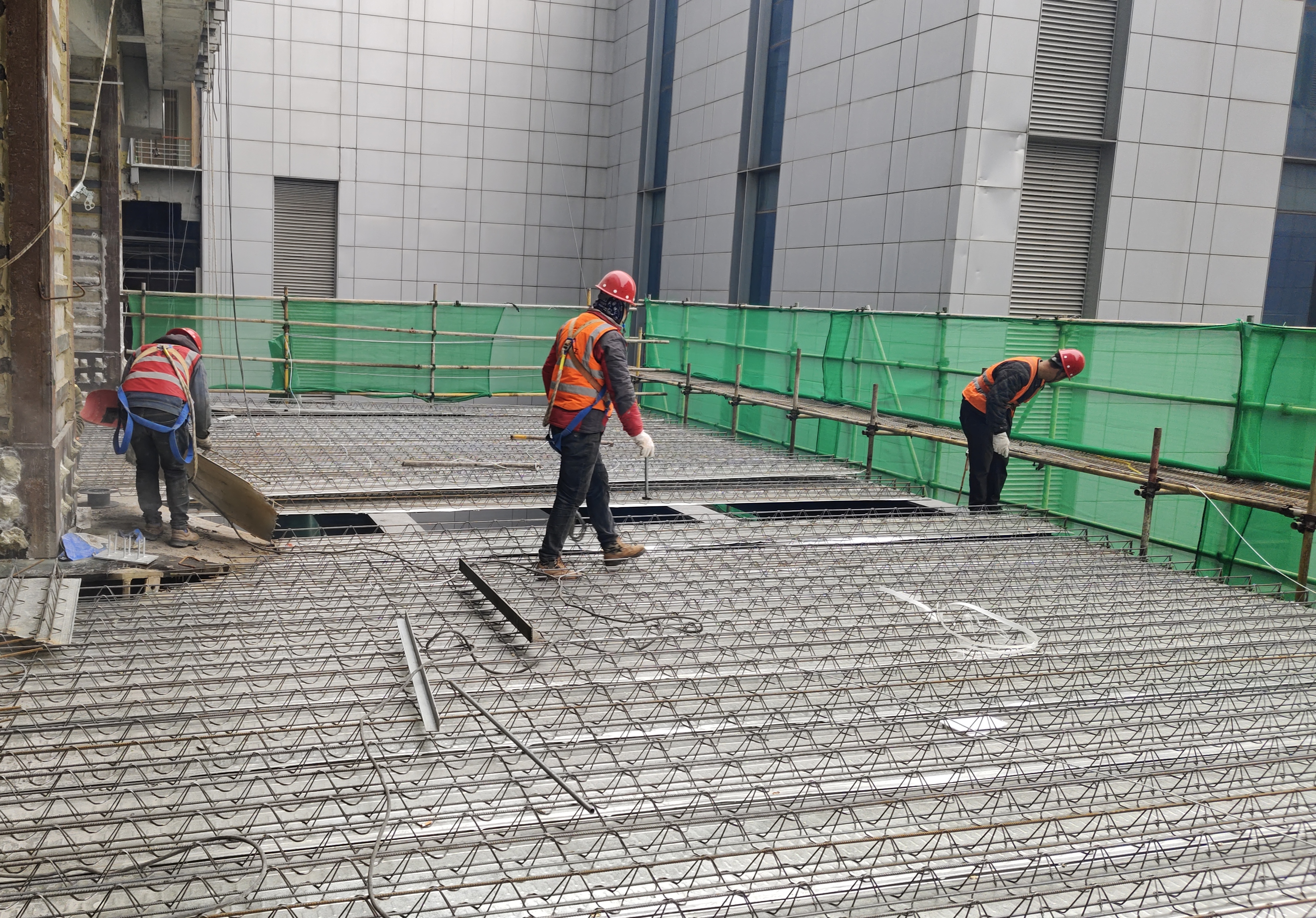 ①2层南侧悬挑加固完成95%,正在进行灌注胶施工,钢梁钢柱吊装安装已完成,客运站加固梁截面加大已完成,1、2层埋板已安装;