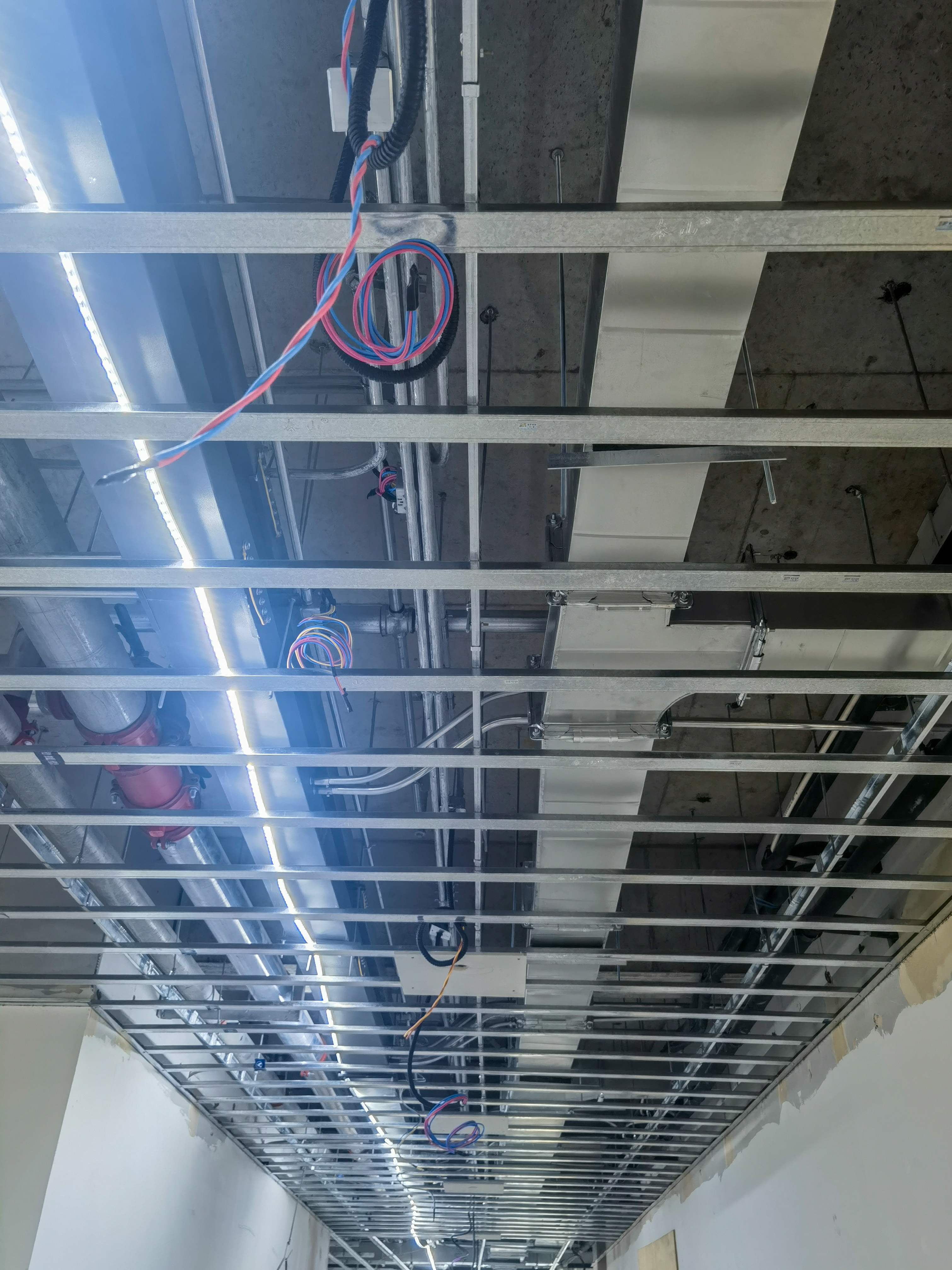 ③15—16层桥架已完成,喷淋管道全部完,顶内配管完成90%,电线电缆敷设完成20%,卫生间给排水管道完成50%;