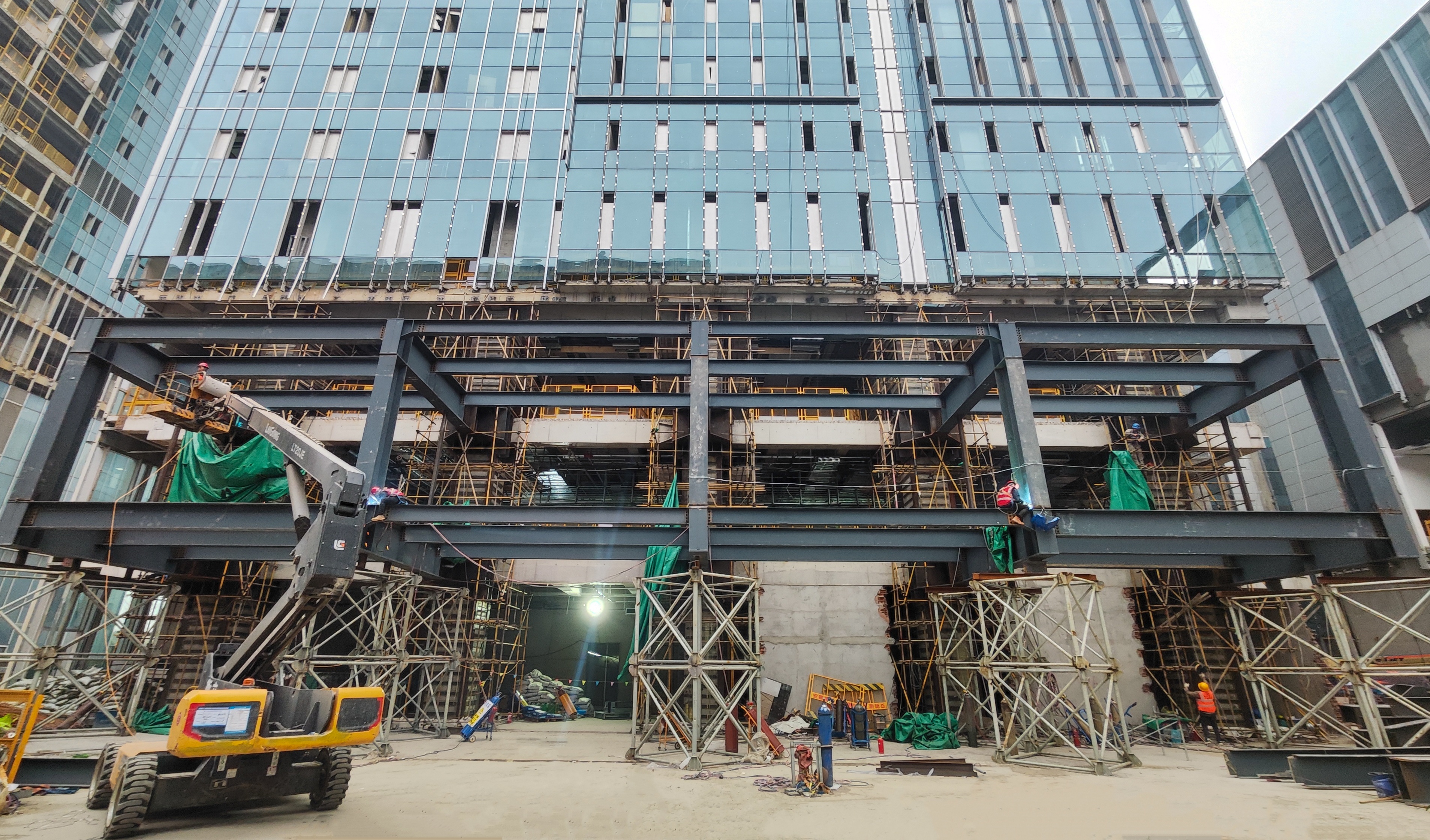 ③项目团队按设计方案在二层三层进行局部扩建,增加室内使用面积,扩建工程包括结构柱加固和外悬挑钢结构施工,其中加固钢结构约130吨,外悬挑增加悬挑结构是约8米长无斜撑钢结构,这种结构较为罕见且难度较大,为保障施工安全、确保施工进度,建工三建项目团队与甲方单位、监理单位、设计单位等多次召开技术研讨会,优化施工方案。为了解决施工中的技术难点,团队增加了钢结构支撑胎架和临时钢柱,扩大了施工作业面。同时,增派施工班组,采用交叉施工的方式,24小时不间断作业,以此来缩短工期,最大限度高效推进施工进度。最终结构柱加固60天完成节点,外悬挑钢结构15天完成节点,共节约了10余天工期,极大缓解了整体工期压力。