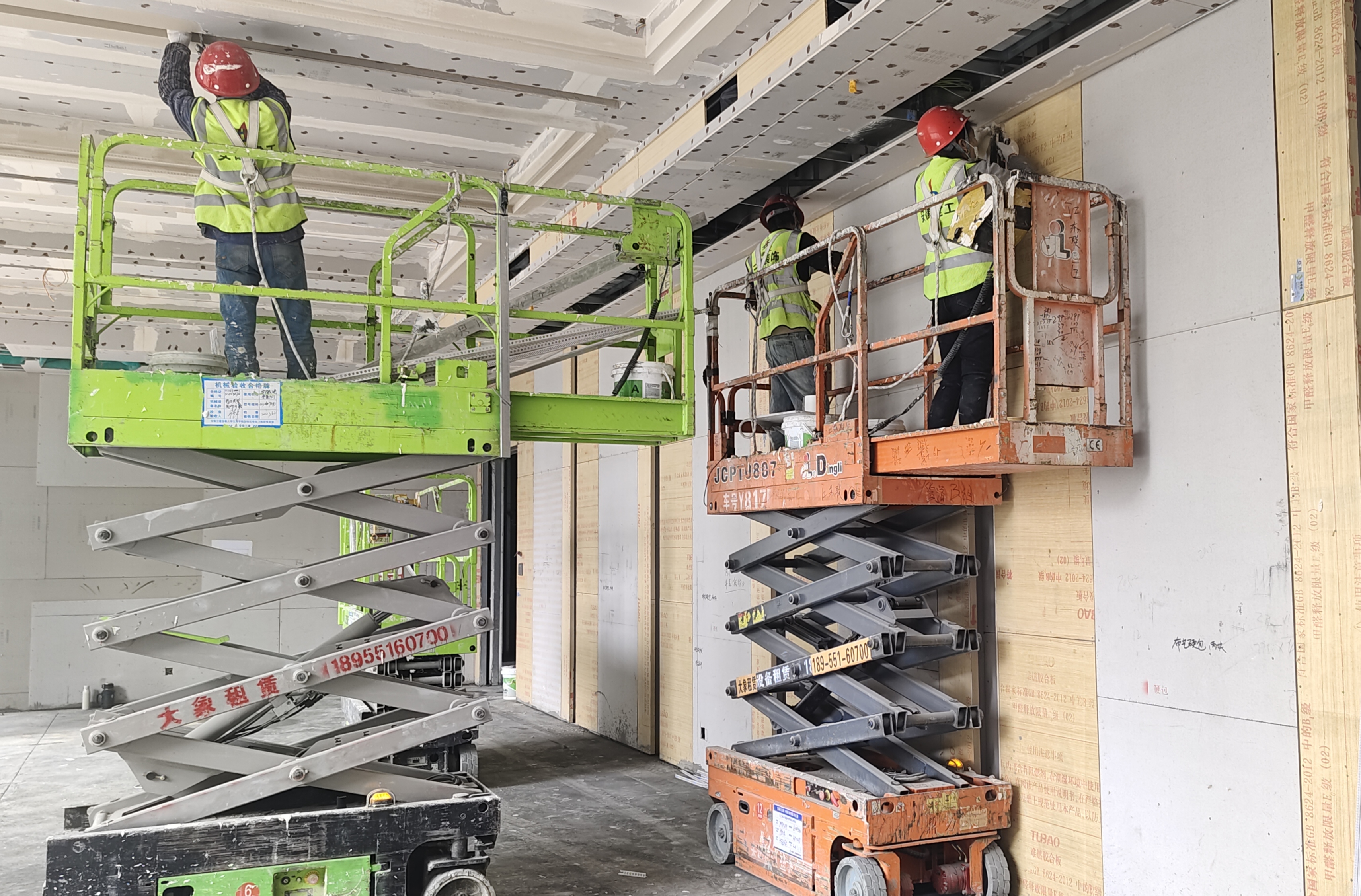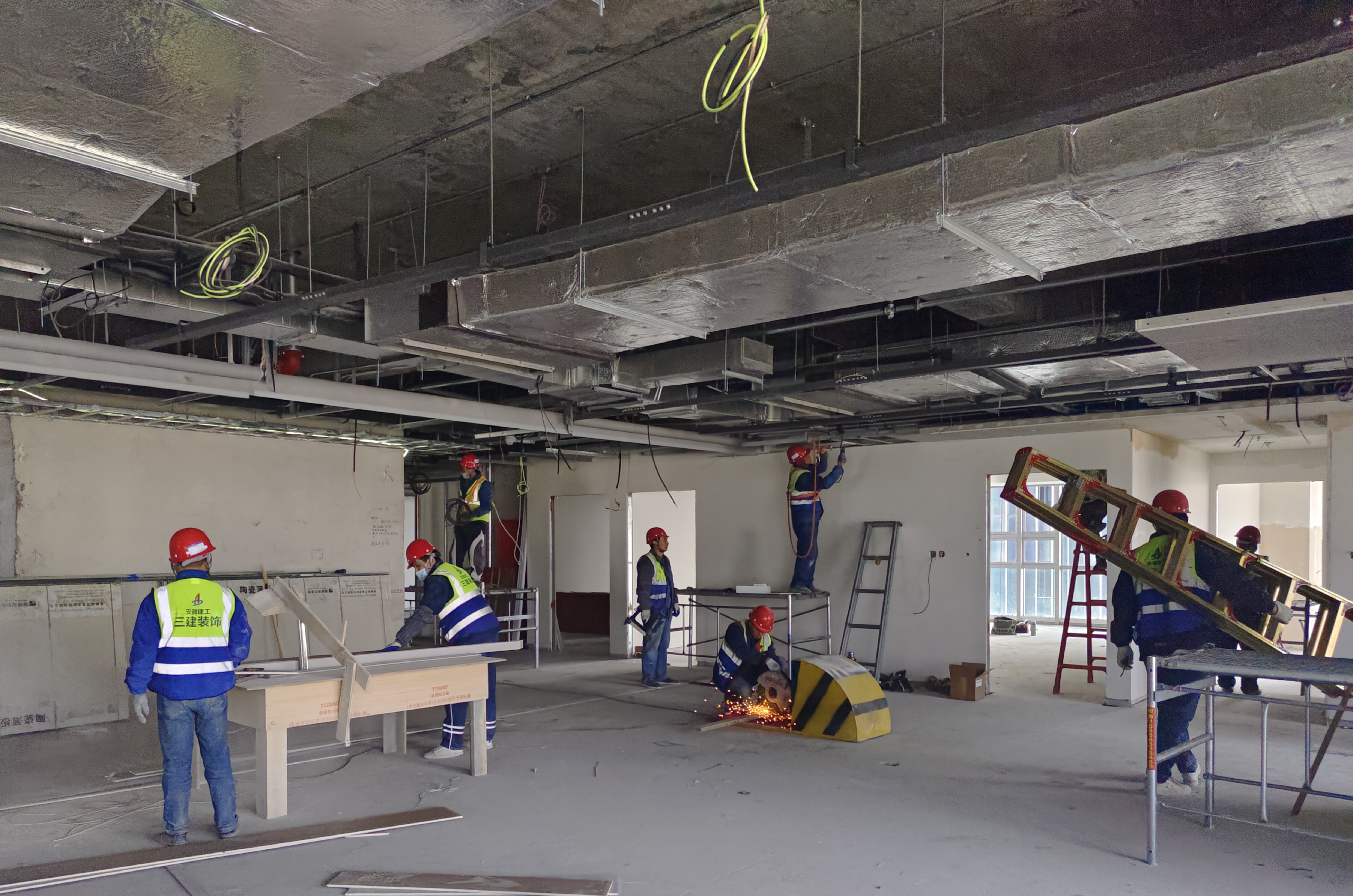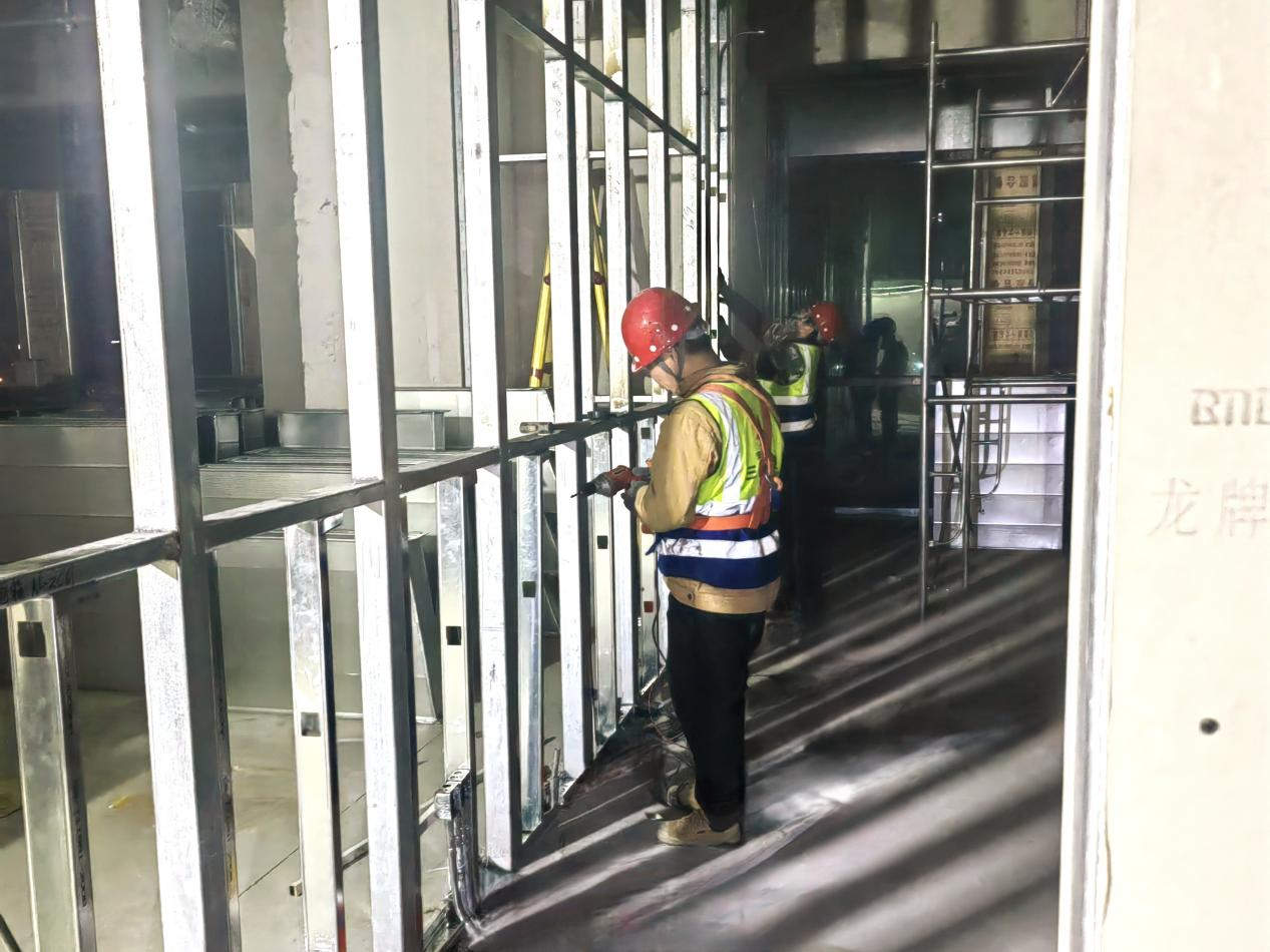 ①1至3层墙面钢骨架已完成,墙面石材干挂完成2%,吊顶龙骨已完成,二层卫生间下沉区回填完成,设备间地砖铺贴完成,一至三层环氧磨石基层完成90%,消控室已完成;