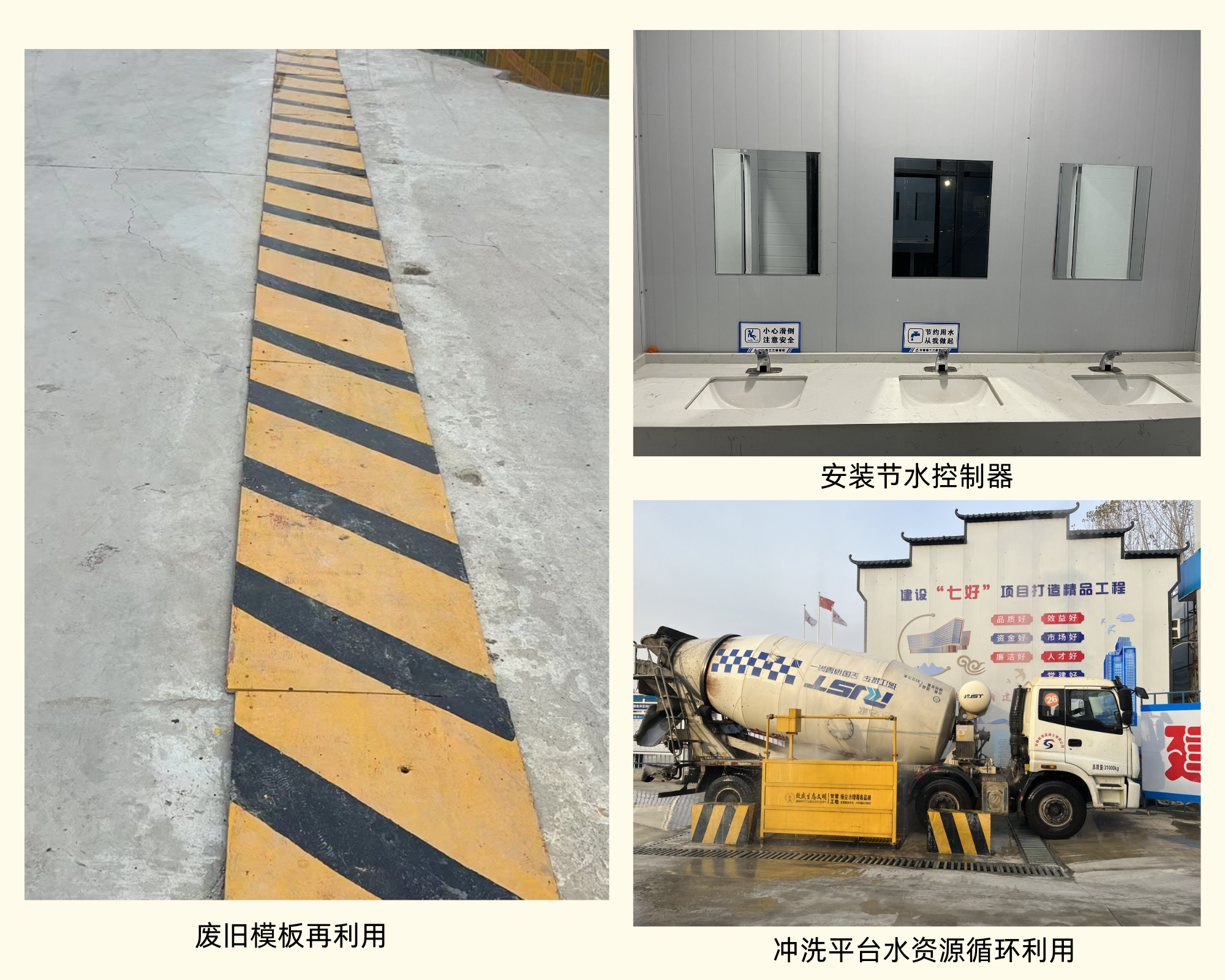 一分公司项目采取废旧模板再利用,将废旧模版刷漆亮化后放在后浇带上,避免出现踩空等安全隐患;卫生间安装节水控制器节约水资源;冲洗平台通过水资源循环利用,达到节约水资源的目的。