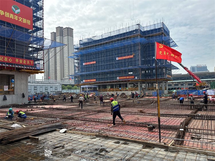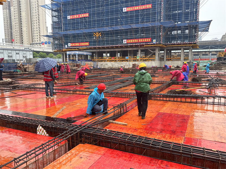 项目迅速组织召开劳动竞赛工作小组会议,充分发挥“两个作用”汇聚生产动能。项目党员充分发挥先锋模范作用,冲锋在前,引领项目全体职工统一思想、团结奋斗,咬紧关键工期节点不松口。面对钢筋原材不足难题,项目发挥钉钉子精神,加强沟通对接,加快推进钢筋原材进场工作,同时积极同联合体单位协商临时借调钢材。针对连续阴雨天气影响施工进度问题,项目青年突击队集思广益,多次研讨确保节点工期任务的解决方案,同时对人防口部墙板集中部位采用架设固定式遮雨棚及移动式遮雨棚措施,给工人提供安全的雨天施工作业条件。
