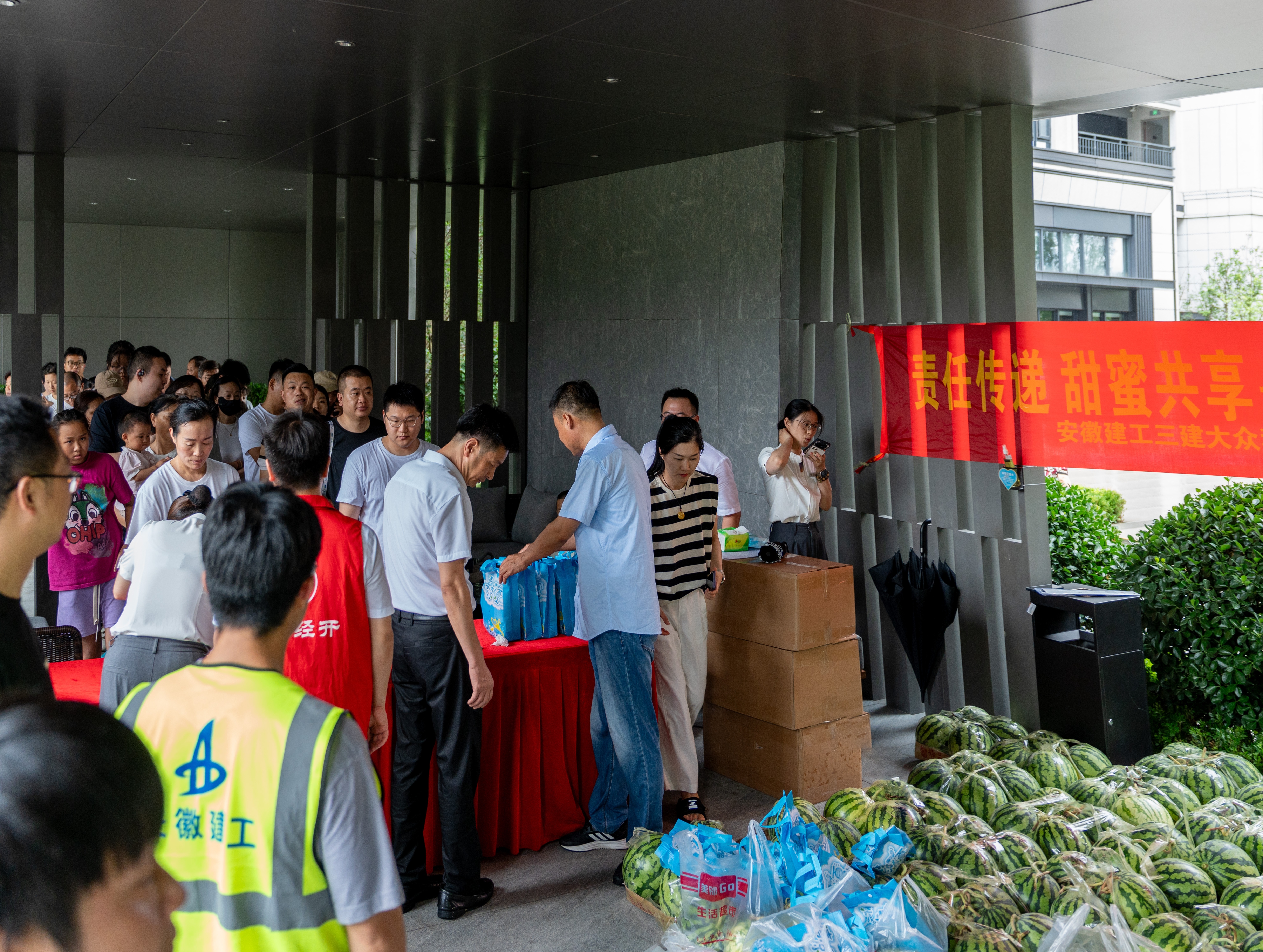 活动现场,大众科技研发三期项目部和临湖社区的党员们将西瓜、清凉包送到居民群众手中,并叮嘱他们在高温炎热天气,要注意防暑降温。每一名接过西瓜的居民脸上都洋溢着灿烂的笑容,“在这么热的天,能吃上一口又大又甜的放心西瓜,真好!”