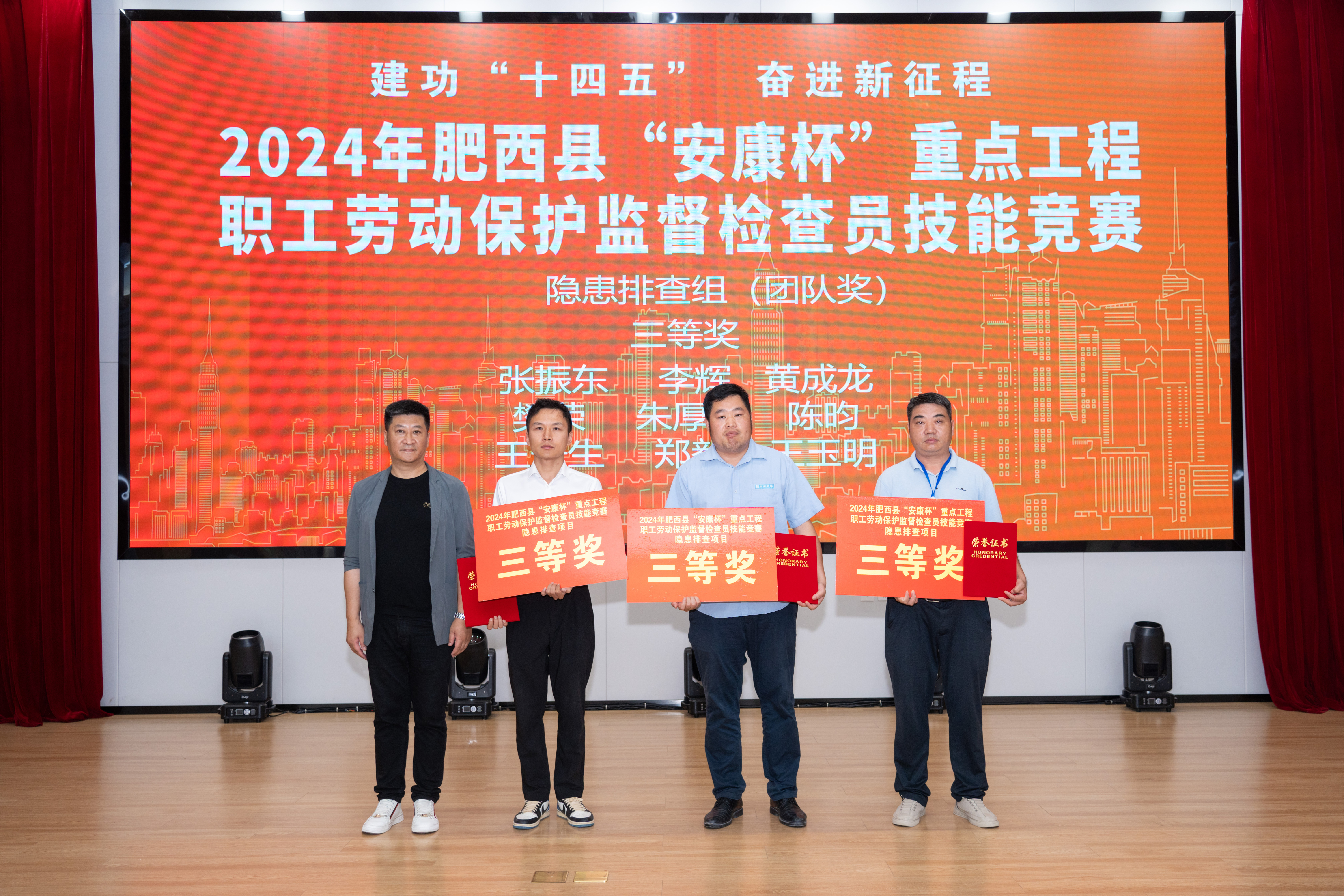 7月4日,2024年肥西县“安康杯”重点工程职工劳动保护监督检查员技能竞赛在肥西县花岗镇举行。建工三建五分公司8名选手在激烈的竞争中凭借扎实的安全知识储备和专业技能素养,获得隐患排查组(团队奖)第二名、第三名和应急救援组第二名和第三名。