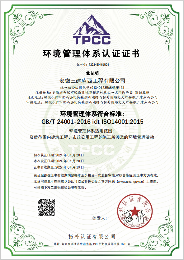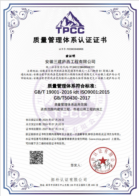 7月20日,三建庐西公司通过资质小组的各项审查,获得了质量、环境、职业健康安全管理体系三项认证证书,标志着分公司在质量、环境、职业健康安全管理方面达到了国家及行业的高标准要求,进一步提升了公司的市场竞争力和品牌信誉。