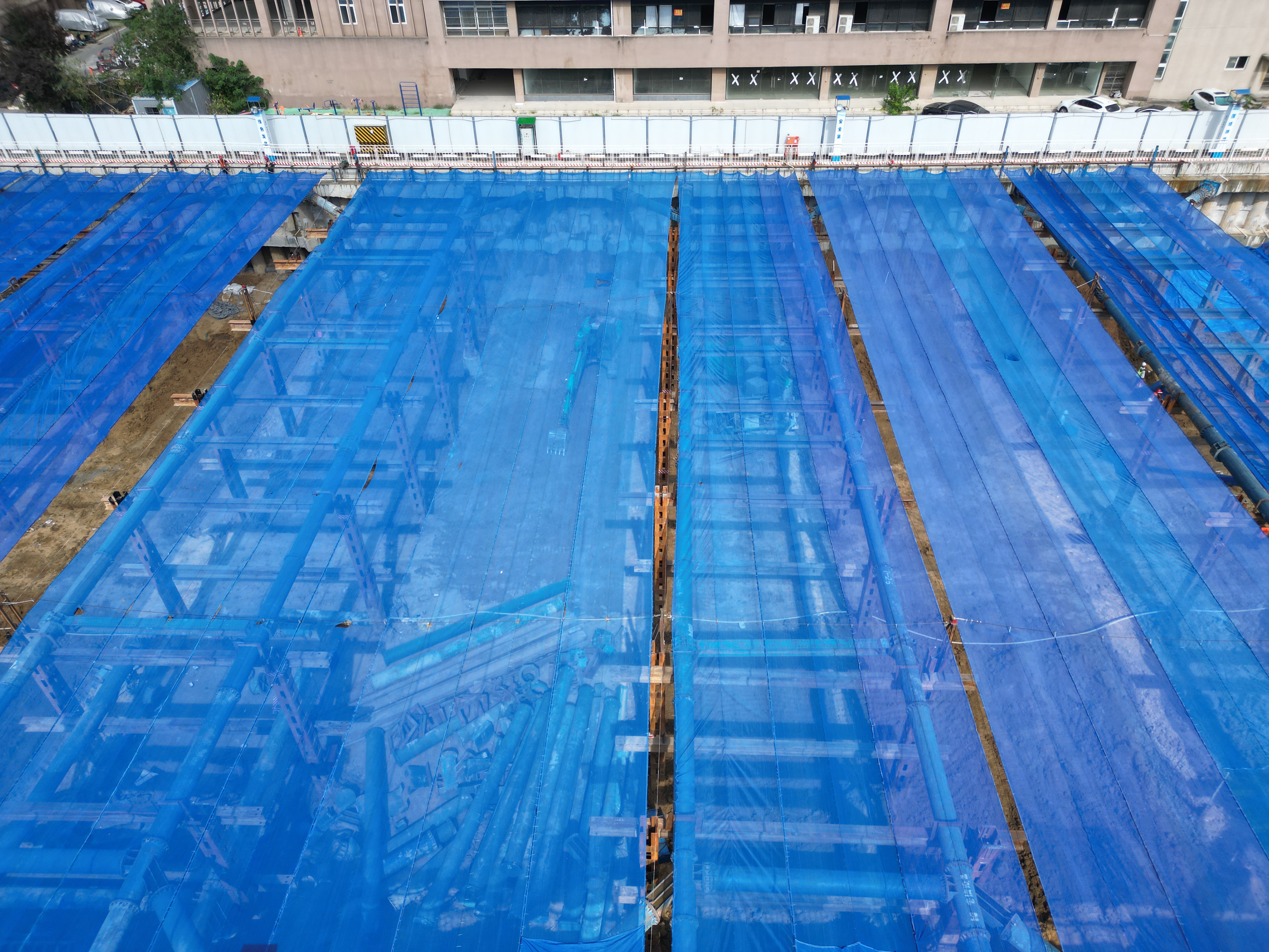 该项目距离市二院住院部及居民区较近,为减小对人居环境的影响,启用“天幕系统”是贯彻落实高质量发展、探索绿色低碳发展的切实举措。与传统的施工作业相比,防尘天幕能够减少80%以上的扬尘,实现6520平方米的基坑全覆盖。在土方开挖和锚喷作业过程中,启用基坑防尘天幕系统的同时与喷淋系统结合使用,通过“天幕”系统将“露天作业”变为“室内作业”,实现整个基坑施工场地“绿色封闭式”管理。