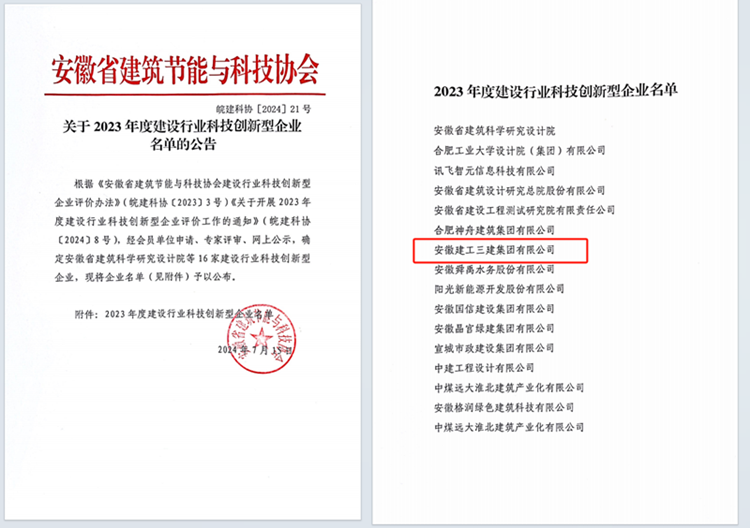 近日,安徽省建筑节能与科技协会公布“2023年度建设行业科技创新型企业”名单,安徽建工三建集团作为唯一一家省属国有施工企业荣登榜单。