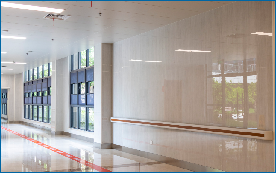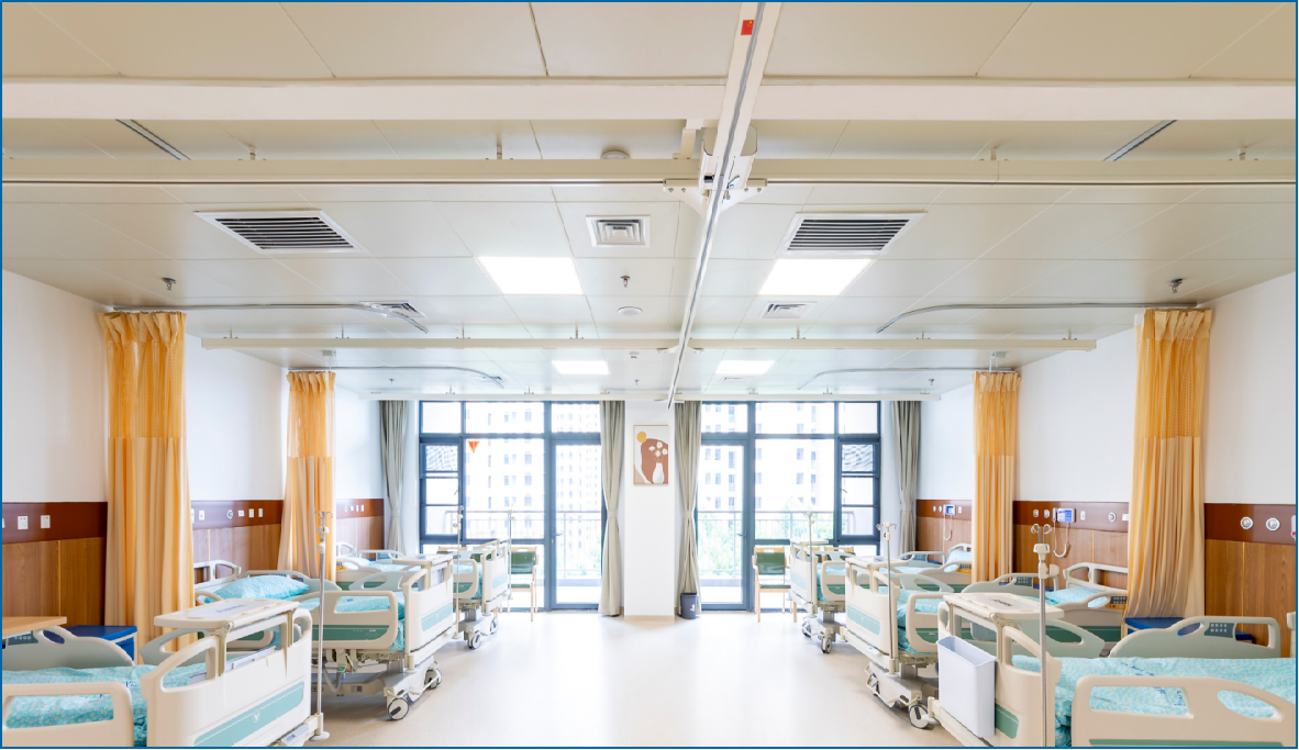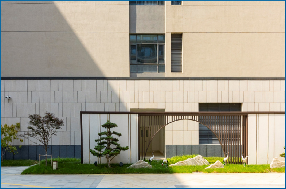 设计上,摒弃了传统医院病房楼的直通式走廊,形成类似“街道+广场”的空间,成为充满生活氛围的社区交往空间,延续家居感觉。根据不同使用人群(失能、失智老年人、自理老人)的需求,设置不同的配套服务功能,以康养轴连接南、北、中部各功能模块,利用无障碍人行通道形成风雨无阻的步行系统。设置智能适老化看护管理系统和无障碍智能载人天轨系统,施工策划全面考虑运营需求,确保系统平稳运行且无交叉、无干扰。