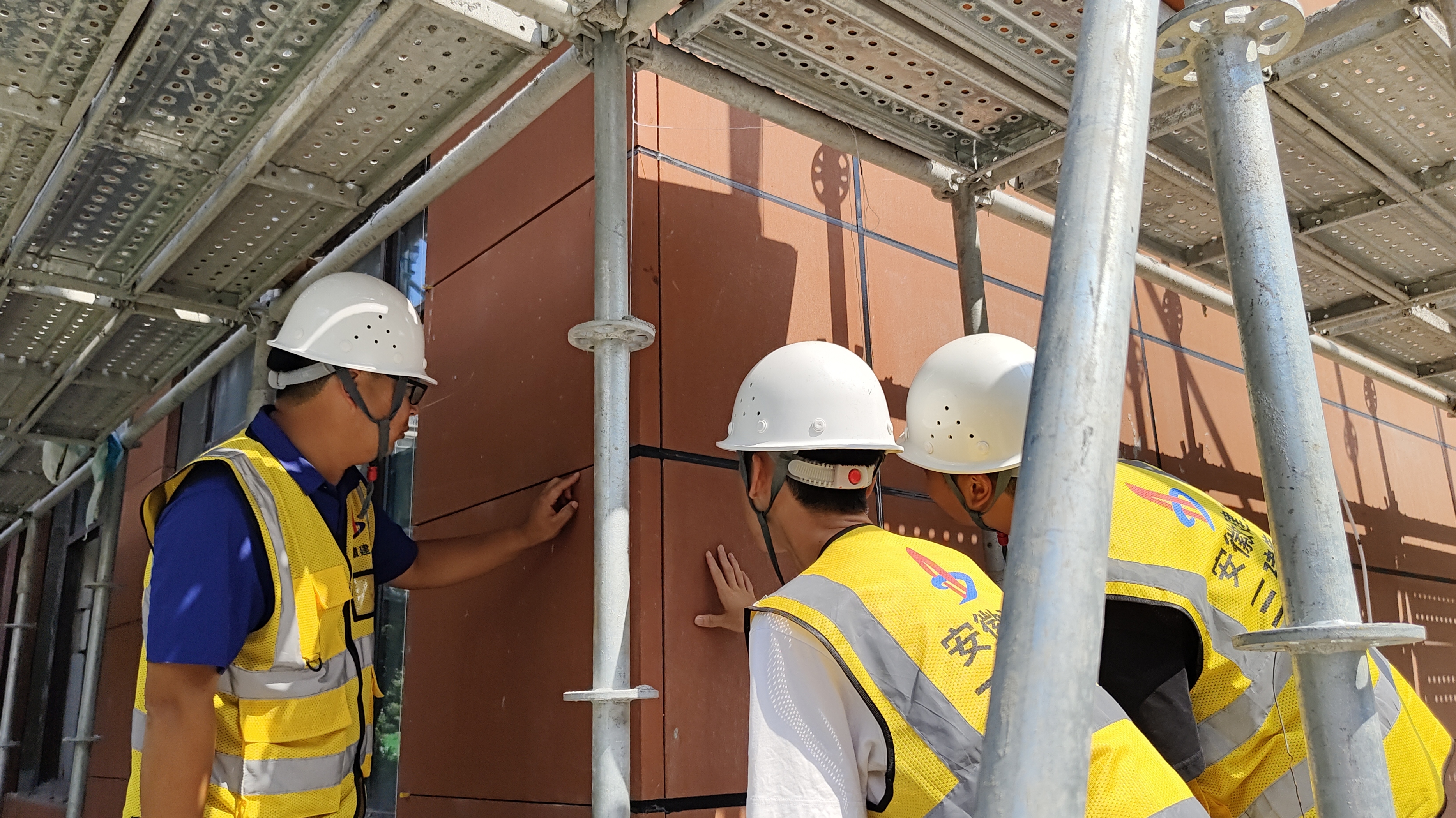 在争分夺秒的抢工阶段,项目团队尤为注重交底工作,鉴于项目采用了省内首例新型材料——全包裹式保温一体板,为确保全体施工人员能够掌握一体板施工标准并按规范精确操作,项目每天召开技术分析会进行交底,管理人员强化现场监督管控力度,实施全天候、全方位的现场监督,严格按照施工规范进行验收,全力保障项目质量一次成优。同时,坚持每日巡查销项制度,对照检查表逐一核实,确保问题得到及时整改,质量隐患得到彻底消除,为项目完成节点目标保驾护航。