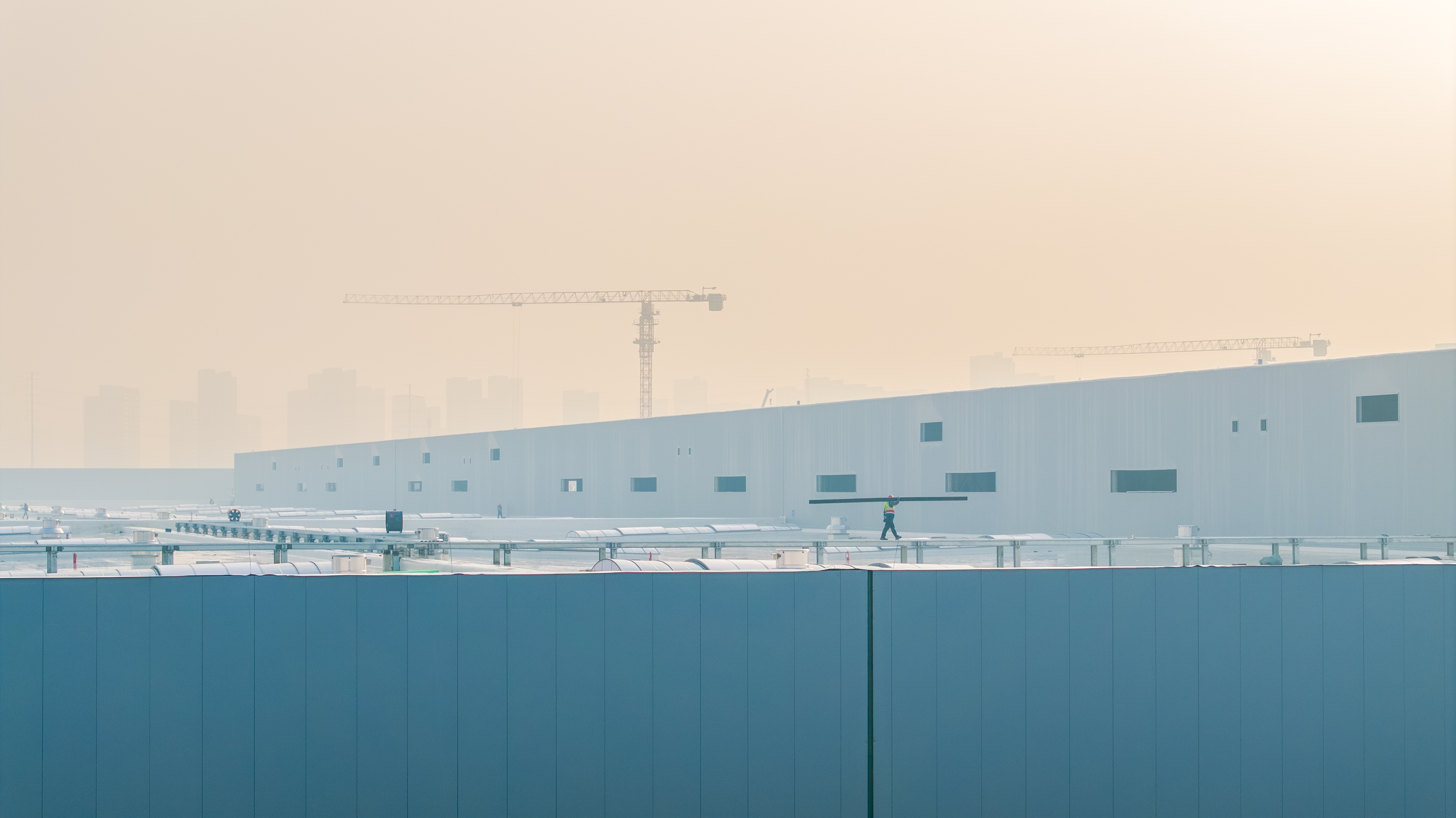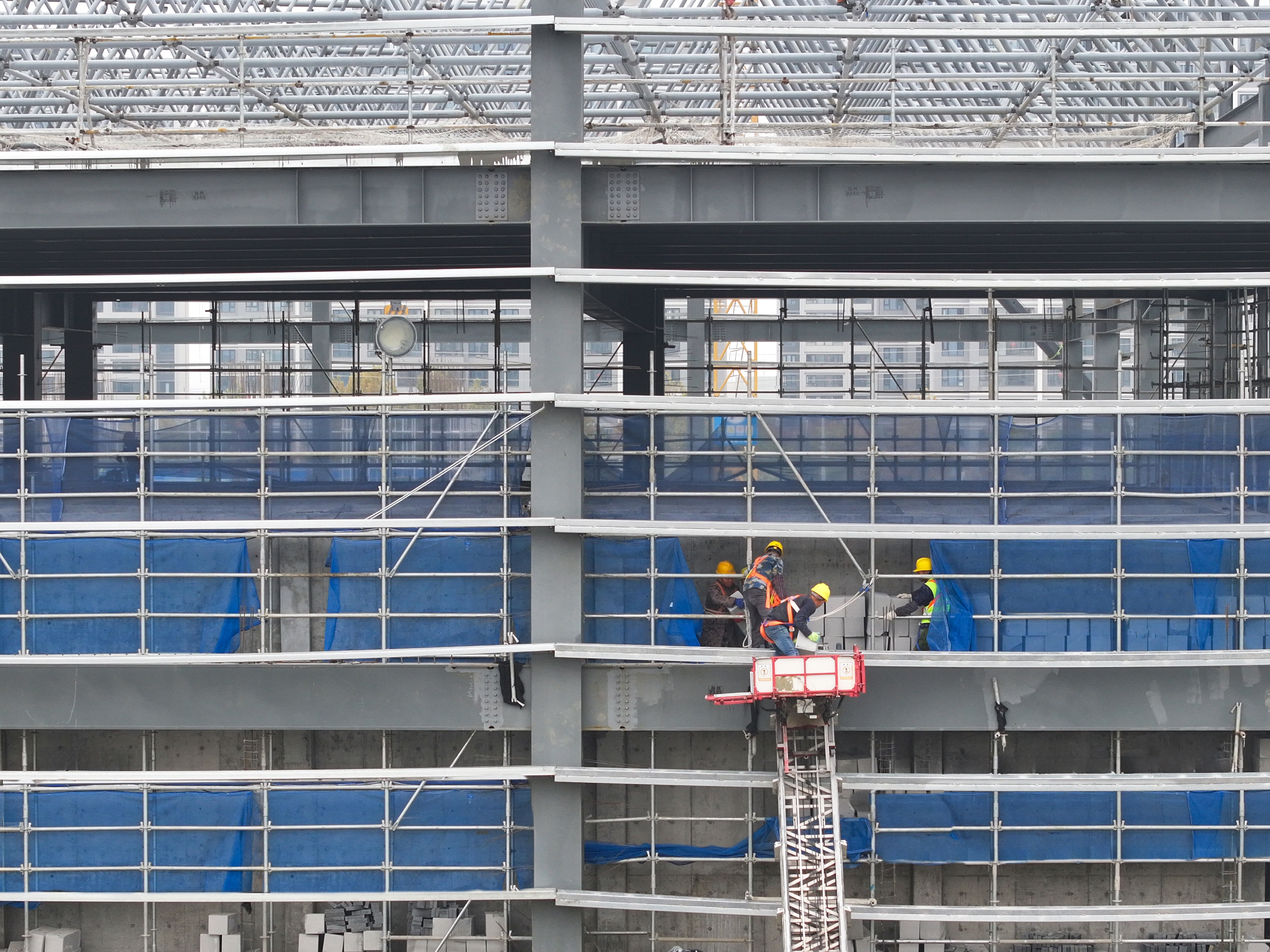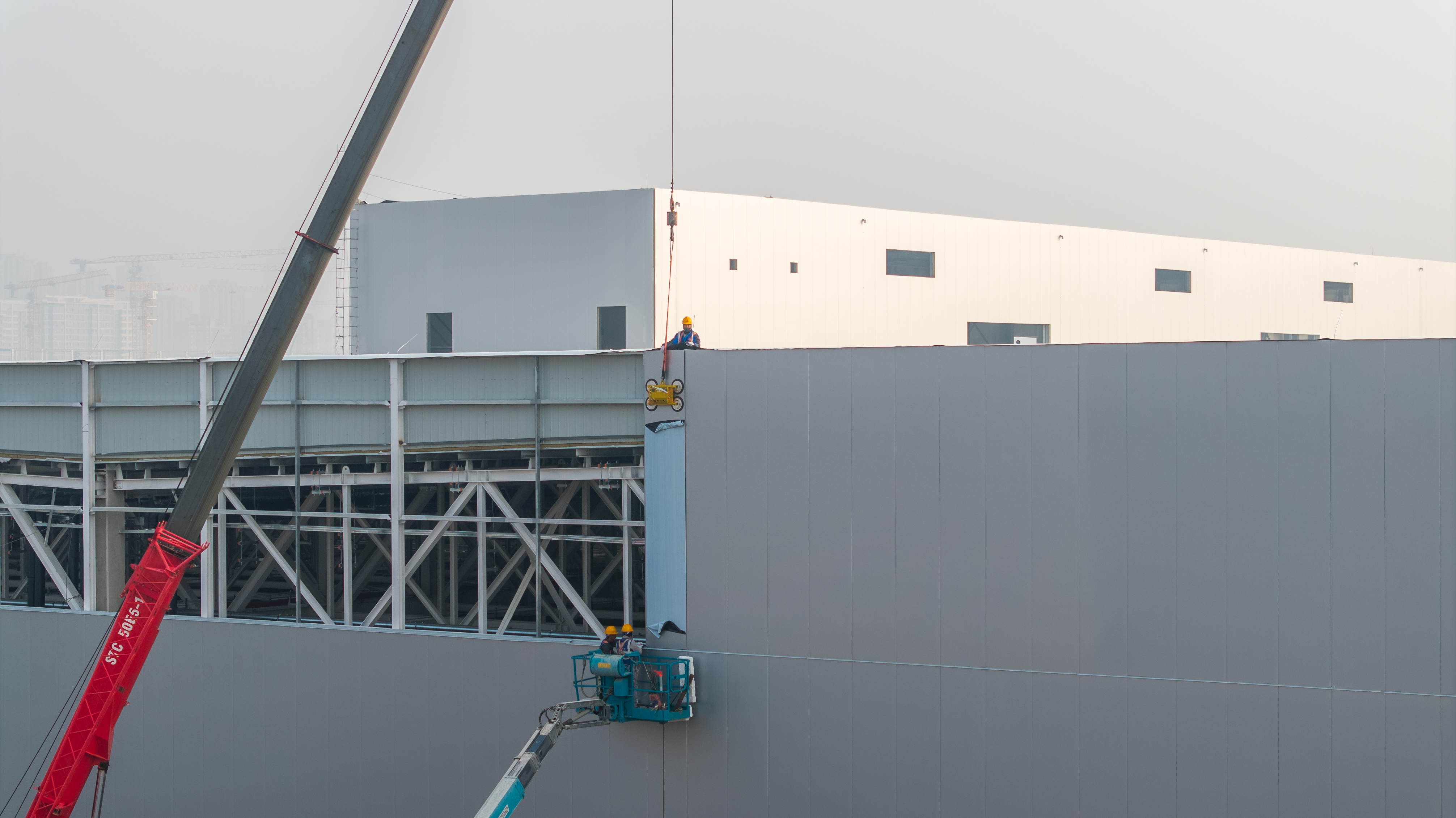 车间三:二次结构、油漆施工、墙体砌筑、地坪固化、ALC墙体、硅酸盐板、防火涂料喷涂、钢结构外墙板施工安装进行中;