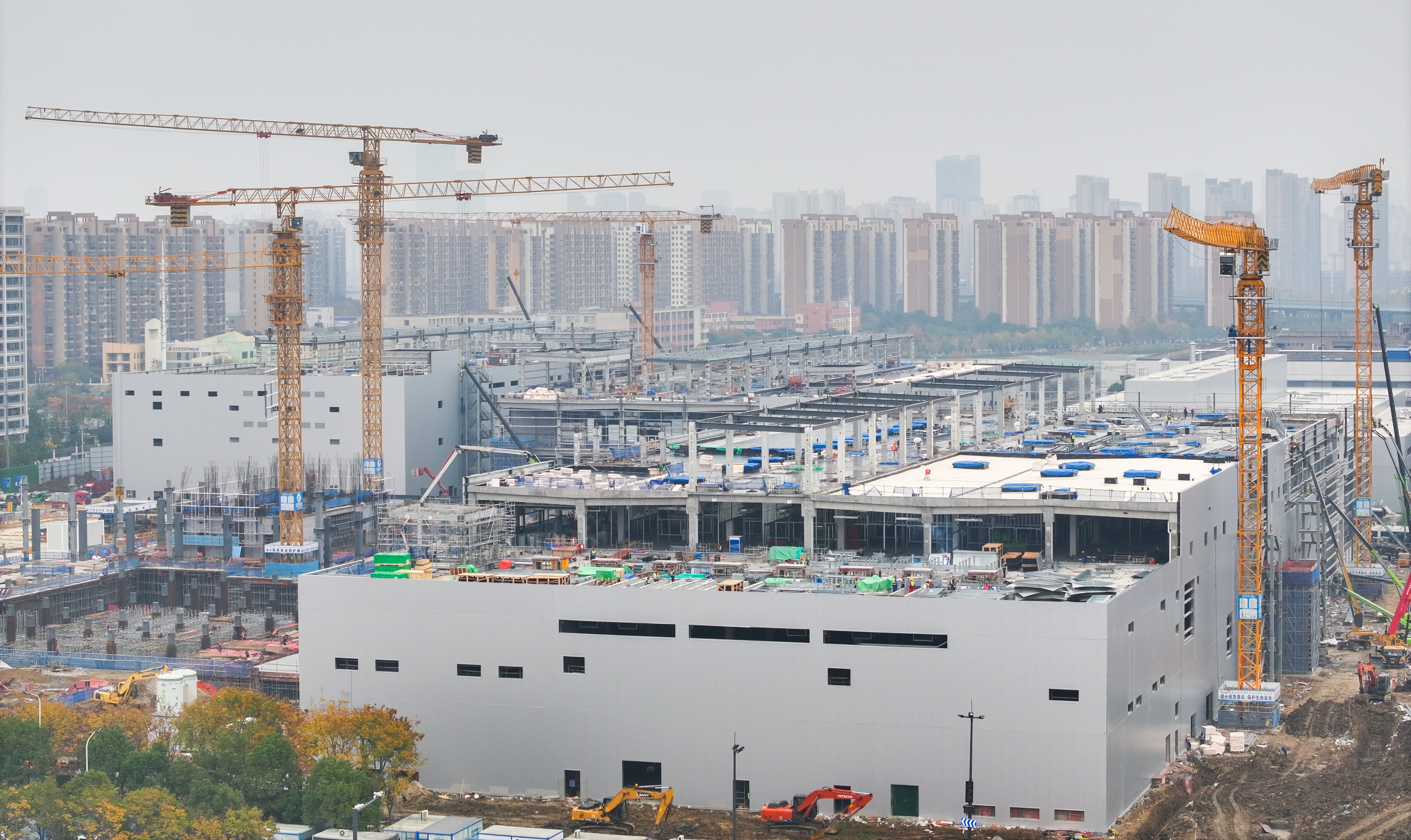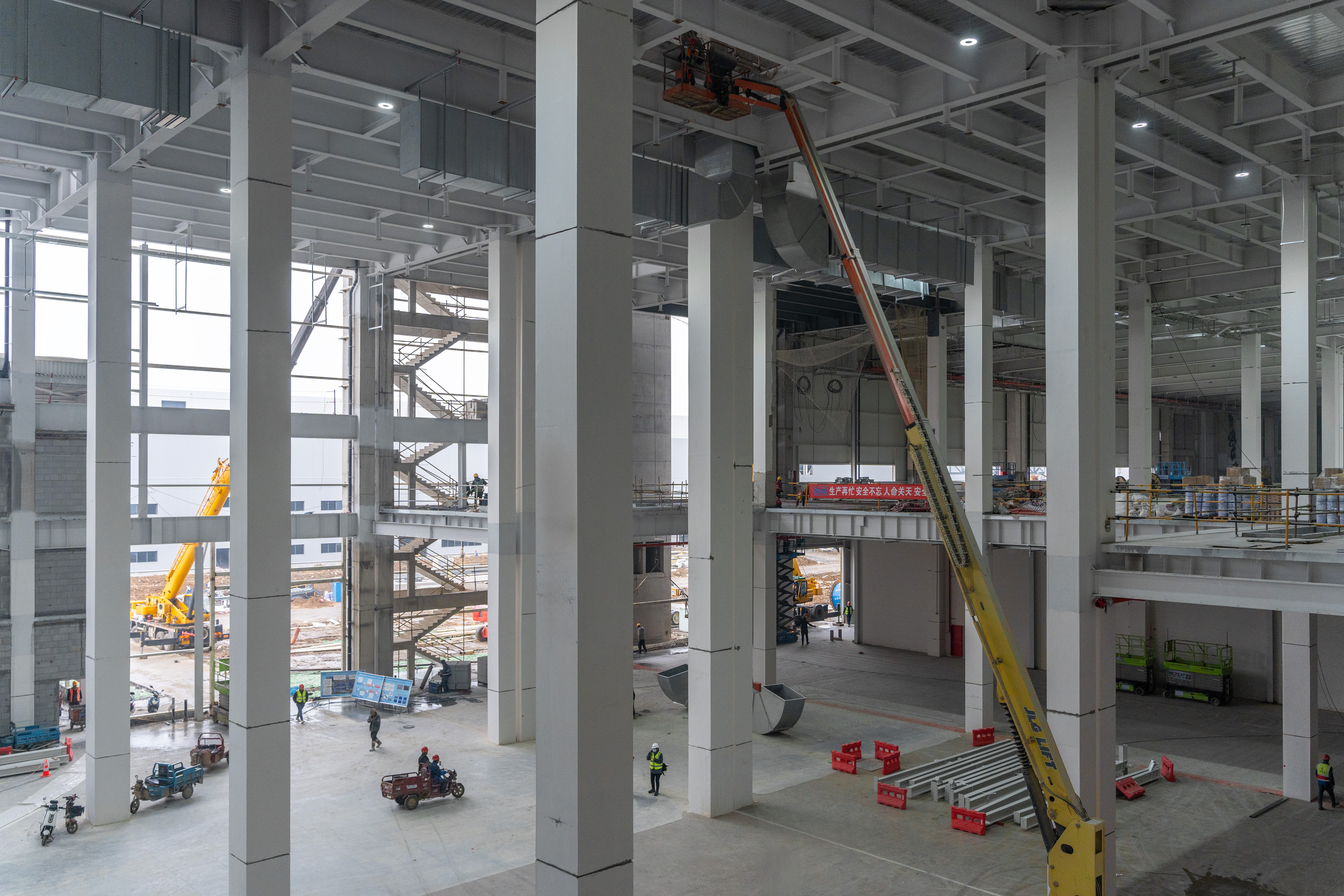 车间一工艺设备进场安装,车间一、车间二正在进行轻质隔墙施工和内墙抹灰,车间三正在进行墙体砌筑,研发及展示大楼主体结构施工至一层,停车楼正在进行基础施工。