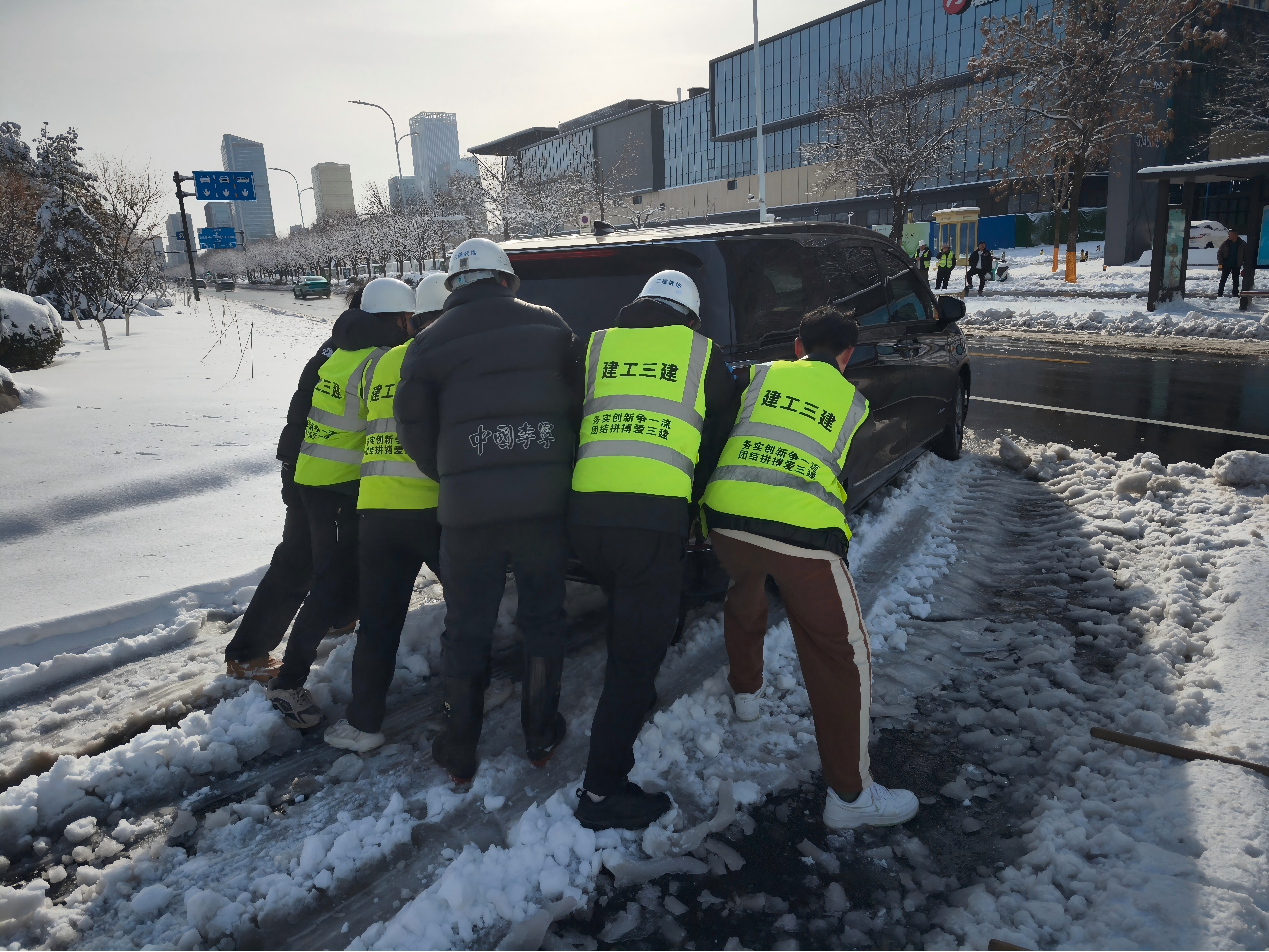 项目党员同志带领职工群众不畏严寒,手持铁锹,一铲一铲地清理着项目周边道路及工作区域的积雪,全力保障施工安全和居民正常通行。在铲雪过程中,项目管理人员为协助车辆被困的路人,仔细清除车辆周围及车轮下的积雪障碍,指挥路人缓慢驾驶,最终成功帮助车辆脱困。