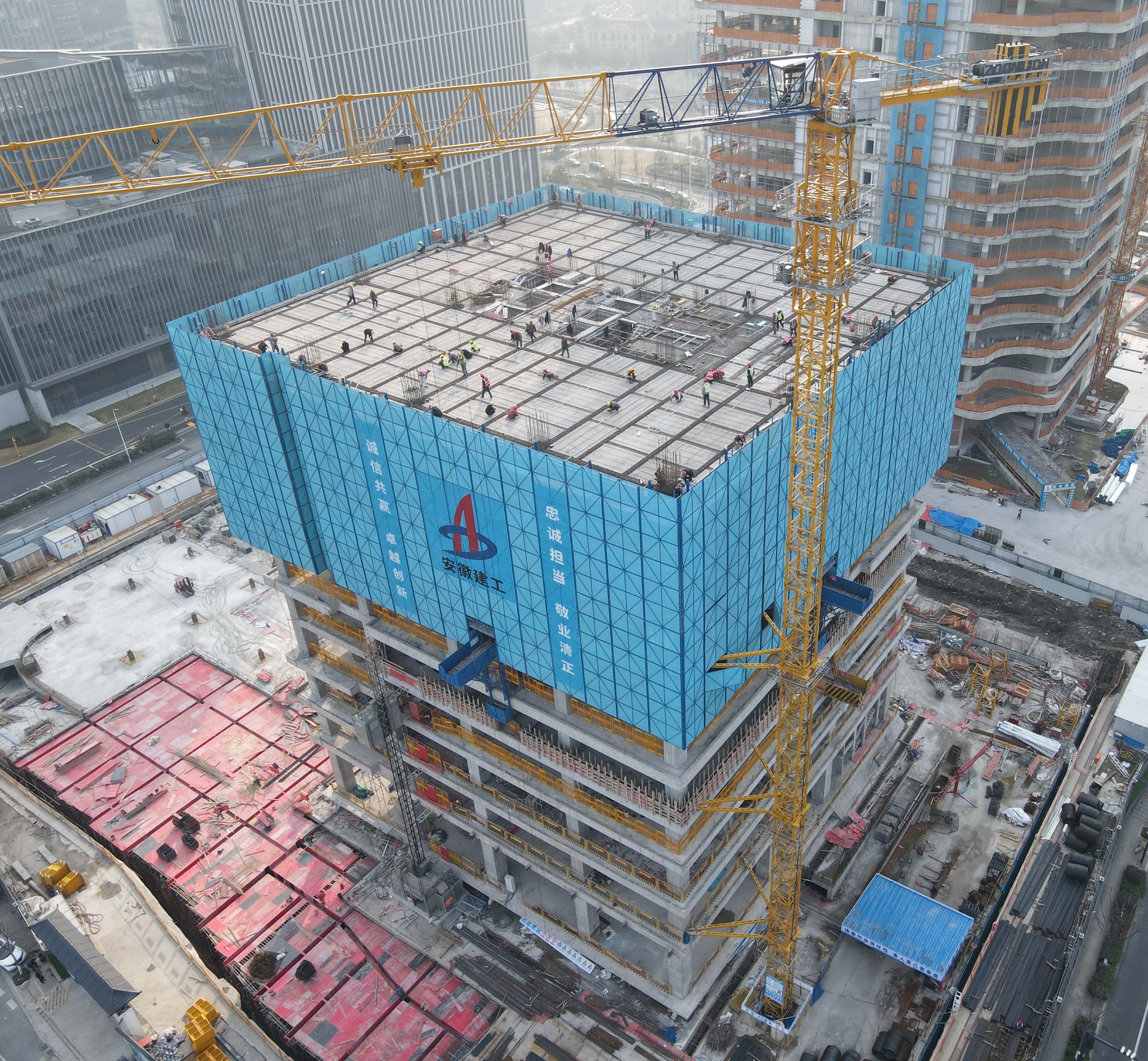 目前,项目建设取得阶段性突破,地下车库已完成结构封顶,主体结构施工进度已达50%,预计将于2025年10月完成项目竣工验收。为保障施工顺利,项目团队精心组织、精细管理,组建党员先锋队和技术攻关小组,及时协调解决施工难题;安全管理人员24小时轮岗巡查,从安全帽佩戴到大型机械操作规范,全方位守护施工现场安全。同时,为提质增效,实施“清单化+节点化”双控管理机制,通过动态资源调度与工序无缝衔接,关键节点达成率100%。