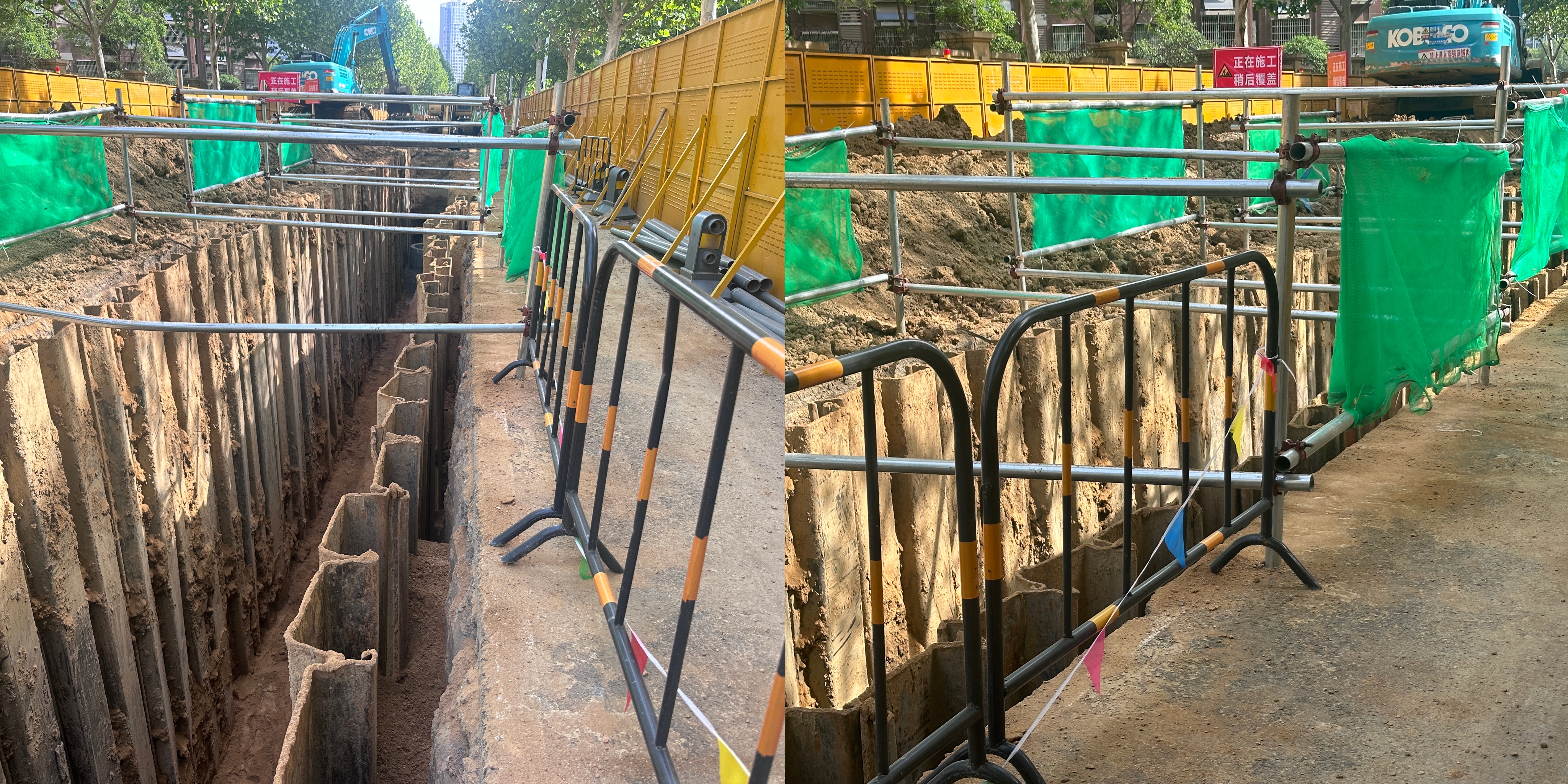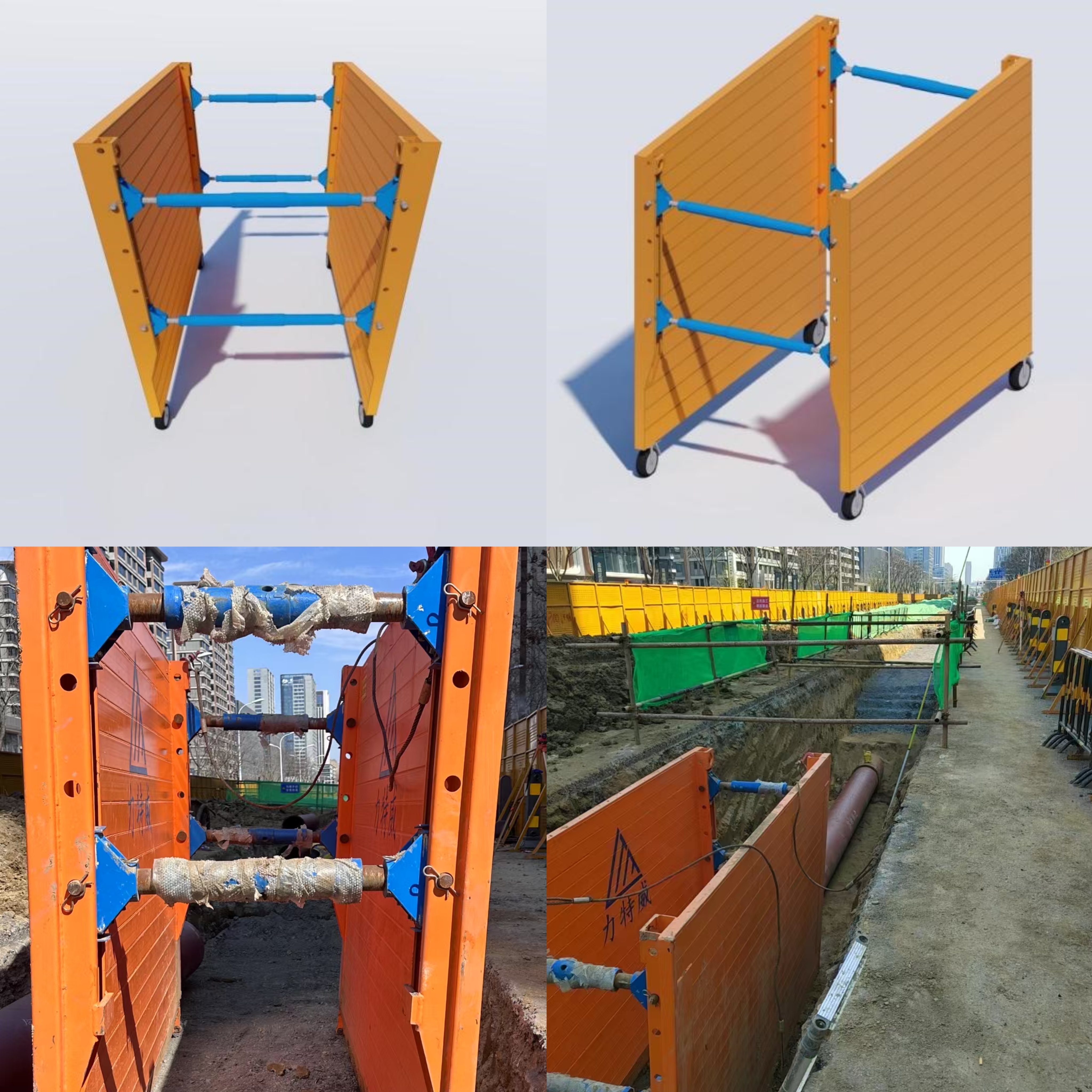 面对工期紧、任务重的严峻挑战,项目部积极探索新技术、新工艺,引入可伸缩箱式支护技术。此项技术充分利用沟槽开挖后两侧土体的临时自稳特性,及时安装支护装置。支护装置以钢箱板抵御侧向土压力,在平行钢箱板间配备多组可旋转调节的液压支撑杆,底部加装带制动功能的移动滚轮。该支护体系集灵活性、稳定性、适应性于一体,不仅可周转使用,还能适配不同槽宽,在保障施工安全的同时,大幅缩短工期,为项目按期完工提供了有力技术支撑。
