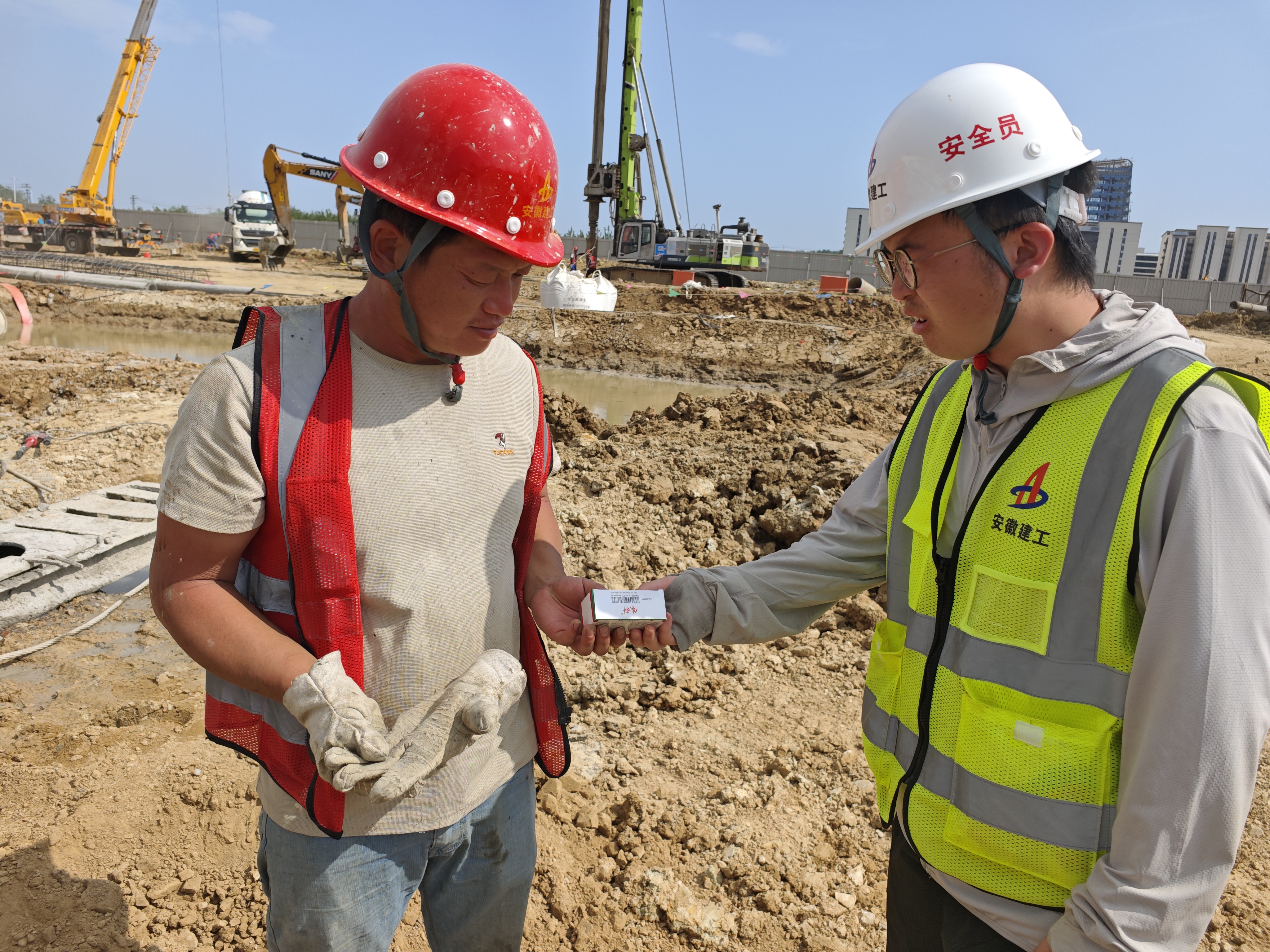 在现场,工人们都在紧张有序地开展施工作业。自首根桩基开钻以来,项目团队合理安排,根据施工要求及不同工种特点,制定了相应的安全管理、质量管理制度,通过班前会、专项技术交底、现场安全交底等方式,确保施工安全,大力推进标准化施工和精细化管理,为下一阶段工程计划推进打好坚实的基础。同时,项目部还在现场增设两处临时休息点,提供藿香正气水、风油精等方式缓解高温天带来的不适,全力保障工人安全作业。