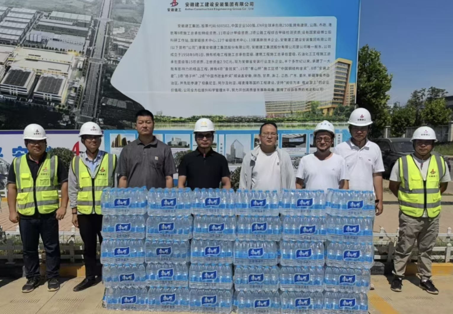 7月10日上午,凤阳县重点工程建设管理服务中心质量安全股主任姜锐一行到公司凤阳县小岗村农产品加工产业园三期建设北区项目调研开工建设情况,并为高温坚守岗位的一线建设者“送清凉”。
