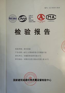 新年的第一个工作日,轻钢龙骨公司迎来喜讯——公司收到国家建筑城建机械质量监督检验中心出具的《检验报告》,报告显示公司生产的QLPJ-A整体附着式升降脚手架符合标准要求,这标志着安徽轻钢龙骨有限公司具备了生产这种产品的资质。此前,2018年11月23日该产品一次性通过了国家建筑城建机械质量监督检验中心专家们的现场验收。至此历经了从市场调研、厂家参观、绘制图纸、图纸定稿、生产、安装的诸多环节,耗时一年零六个月,该产品终于取得了“出生证”。