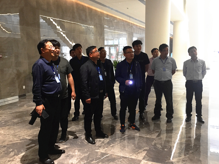 观摩中,孙俊中对所有项目人员表示亲切的慰问,在现场听取了项目负责人王皖对安徽创新馆整体建设情况介绍。随后孙俊中一行参观了二号馆、三号馆。装饰公司项目经理刘维向观摩团介绍了二号馆室内环氧磨石工艺、PVC石塑地板铺贴技术以及三号馆全球路演中心超大型艺术造型钢板安装技术等等。馆内光可鉴人的环氧磨石地面、轻质飘逸的穿孔铝板、气势宏伟的路演中心给孙俊中一行留下深刻印象。