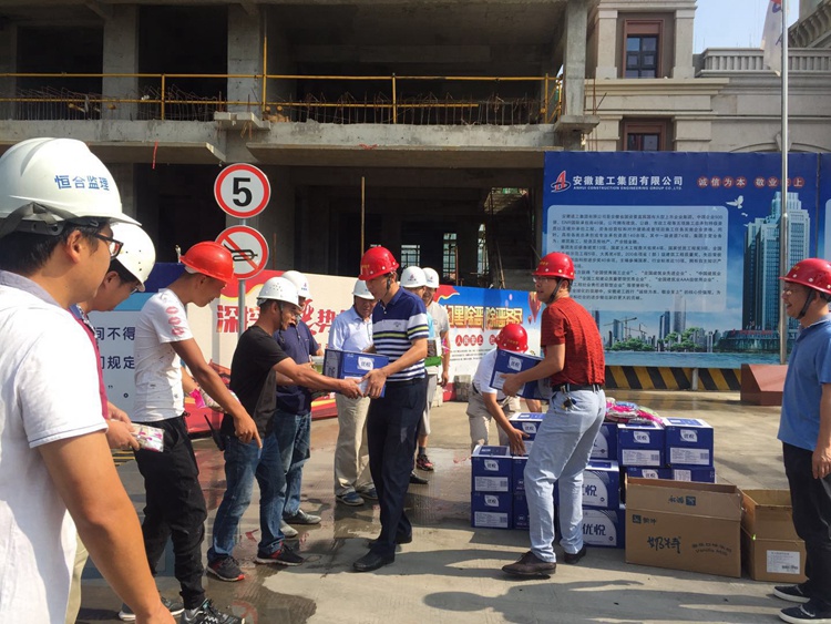 姚永一行深入恒大御府项目一线,详细了解项目基本概况与工人工作环境,询问了项目上防暑降温措施落实情况,随后为在高温下作业的工人们送去了矿泉水、毛巾、藿香正气滴丸等防暑降温物品,把清凉送到了一线工地,把关怀送到了工人的心里。姚永主任叮嘱项目部,要采取“干两头、歇中间”的方式,合理安排作业时间,防止高温中暑安全事故的发生。他要求项目部要增强高温作业的安全意识,做好防暑降温的常识宣传,在确保施工质量和安全的前提下确保项目工期履约,做到安全生产与防暑降温两不误,确保平安度夏。
