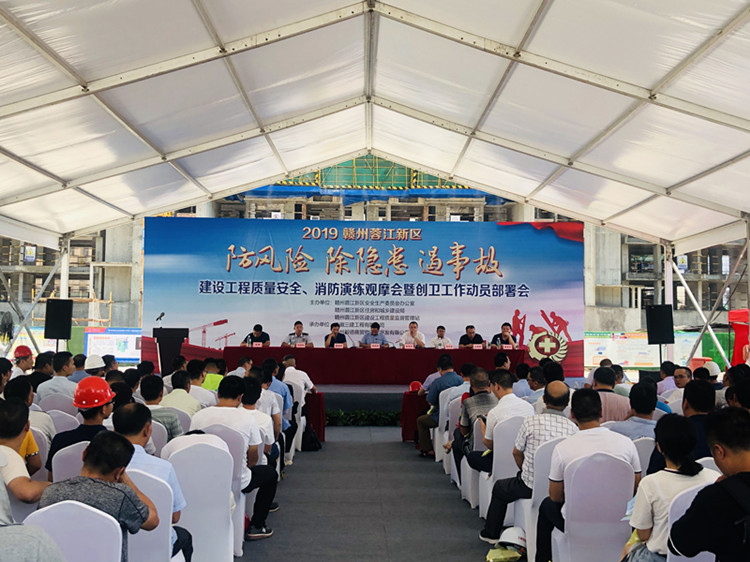 7月17日,2019年蓉江新区“防风险 除隐患 遏事故”主题建设工程质量安全、消防演练观摩会暨创卫工作动员部署会,在安徽三建赣州毅德商贸物流园E05地块二期项目举行。蓉江新区住建局局长晏剑坤主持会议,赣州市经开区消防救援队中队、蓉江新区管委会、赣州市质监站、蓉江新区项目办、蓉江新区质监站、蓉江新区建投公司相关领导出席会议。