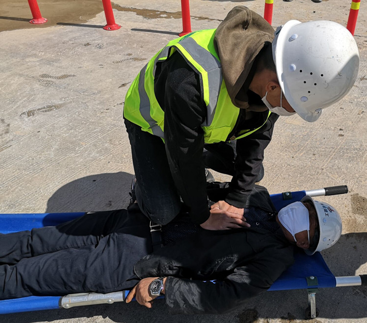 演习中,突发火灾报警声响起后,灭火组、疏散组、警戒组、抢救组迅速到位,灭火组立即拎起灭火器冲向着火点进行灭火;疏散组迅速赶往施工现场、楼梯间及安全出口处,通过口令加手势,指挥现场施工人员从指定路线有秩序疏散到安全地带,并做好人员的清点统计;警戒组在着火点做人群隔离,并对通道进行清理,以便消防车进入;抢救组立即用担架就将受伤人员抬离安全地带,并实施抢救措施。演练现场大家按照项目部编制的《火灾应急救援预案》,紧张、迅速、有序对火灾事故警报做出反应,顺利完成演练工作。